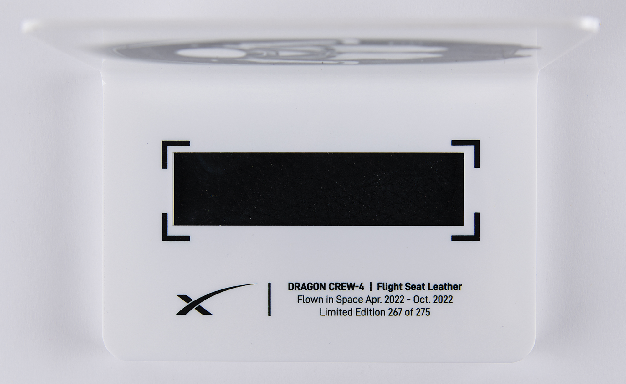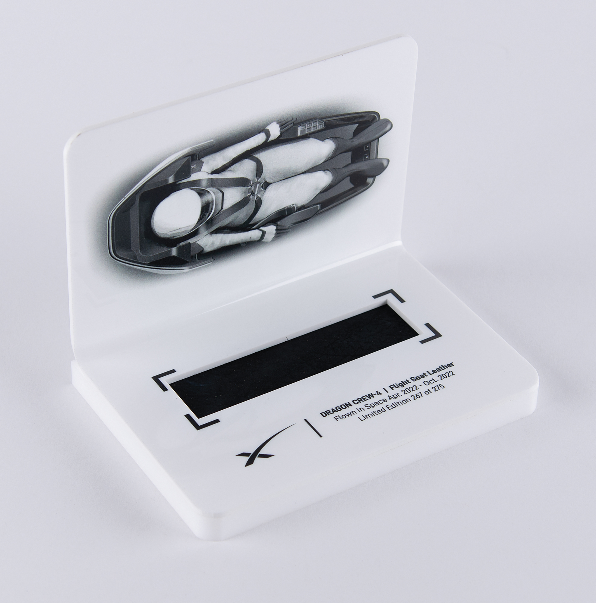 Limited edition display featuring a flown swatch of black seat leather from the SpaceX Dragon Crew-4 mission, measuring 4˝ x 1˝, encased in a white plastic stand with an image of a SpaceX astronaut, numbered 267/275. The display stand measures an overall 6˝ x 5˝ x 4˝. In fine condition. Lasting from April 27–October 14, 2022, Crew-4 was the maiden flight of the Crew Dragon spacecraft named 'Freedom,' so named such by the crew because it 'celebrates a fundamental human right, and the industry and innovation that emanate from the unencumbered human spirit.'