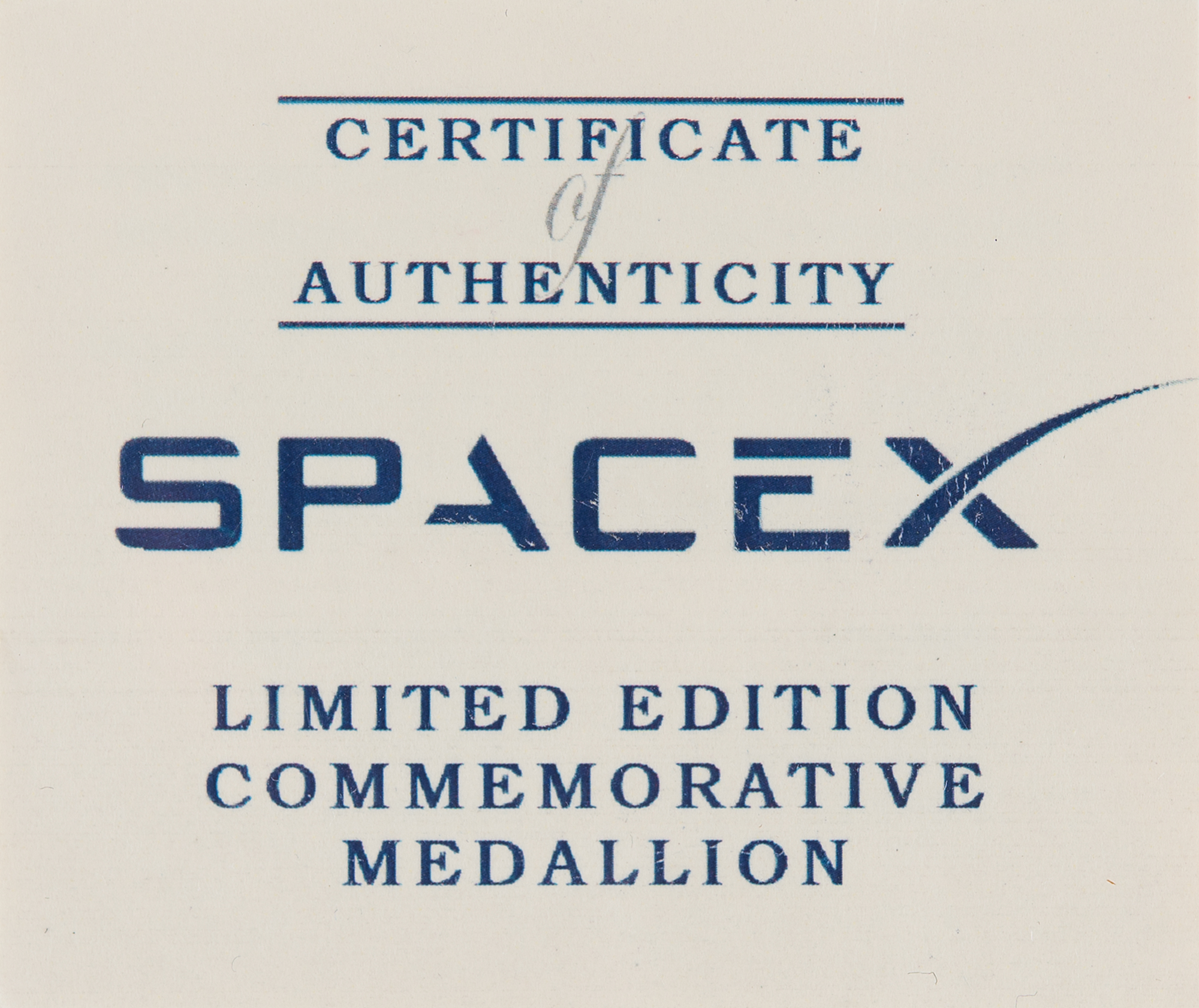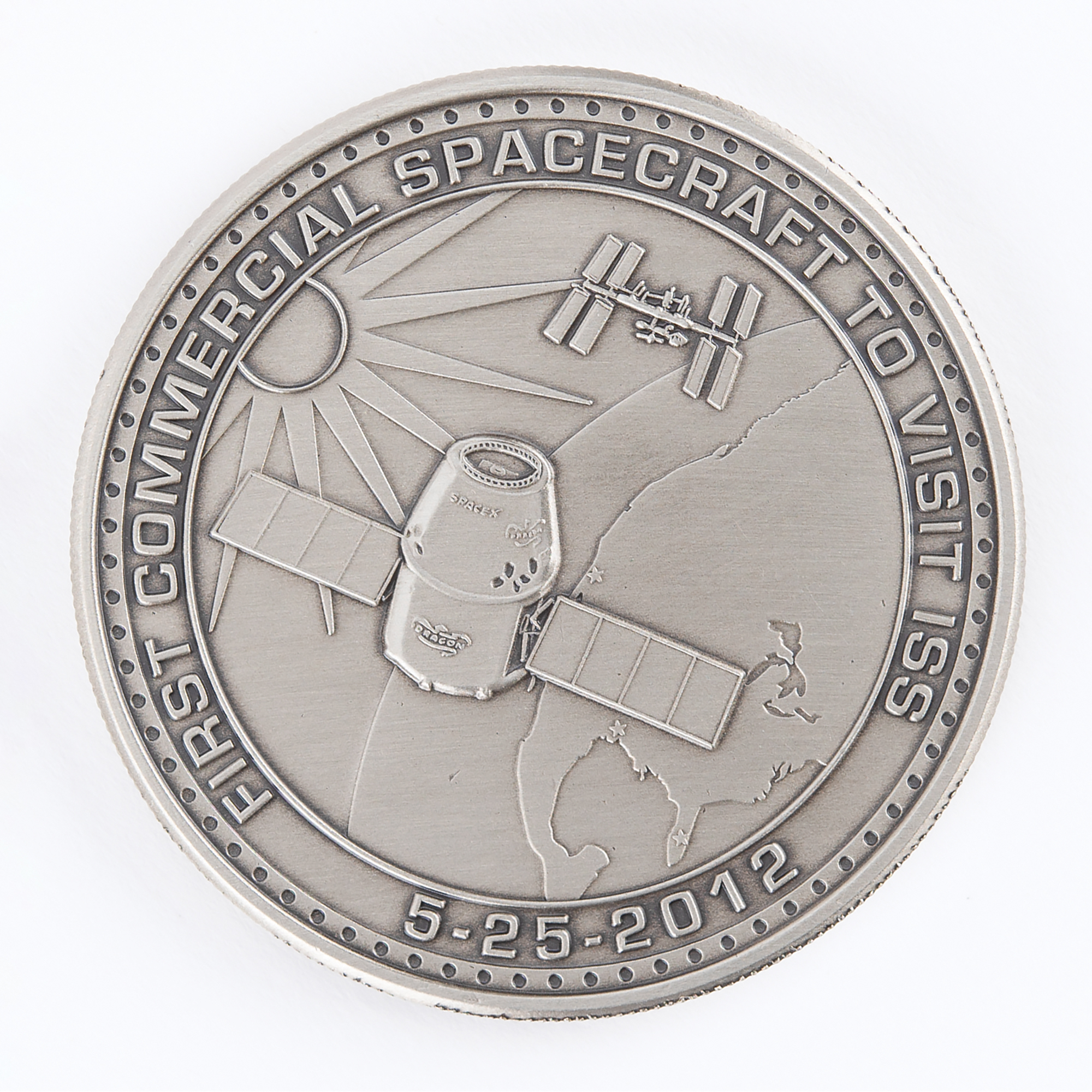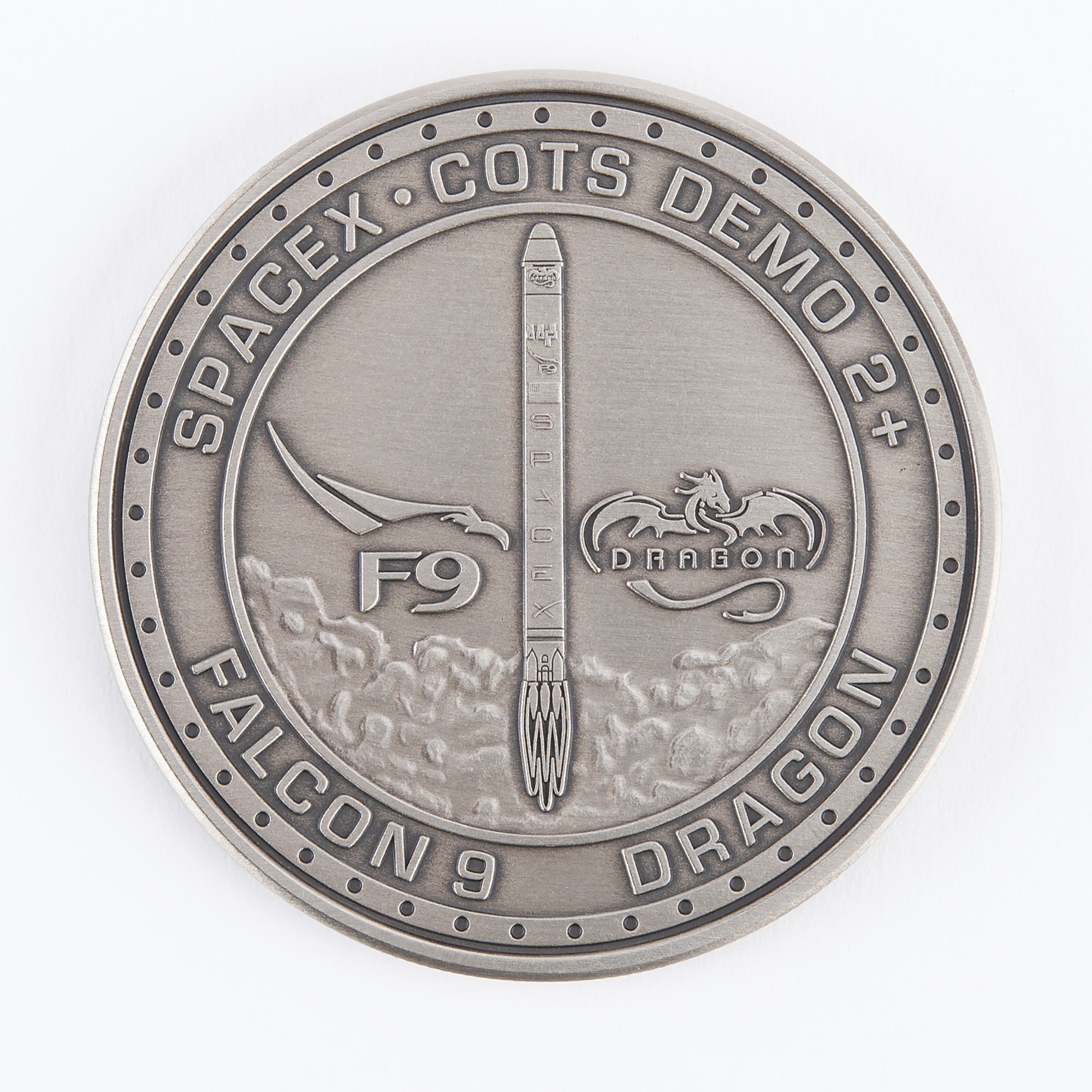 Limited edition coin commemorating the Commercial Orbital Transportation Services mission and the SpaceX Dragon spacecraft. Nickel alloy, 44 mm, 48 gm. The front features a raised emblem with Falcon 9 launch vehicle and surrounding text: "SpaceX-COTS Demo 2+, Falcon 9, Dragon"; and the reverse depicts the Dragon spacecraft floating towards the ISS, with encircled text: "First Commercial Spacecraft to Visit ISS, 5-25-2012." In very fine condition. Accompanied by a certificate of authenticity from SpaceX. This commemorative coin was only available to SpaceX employees.