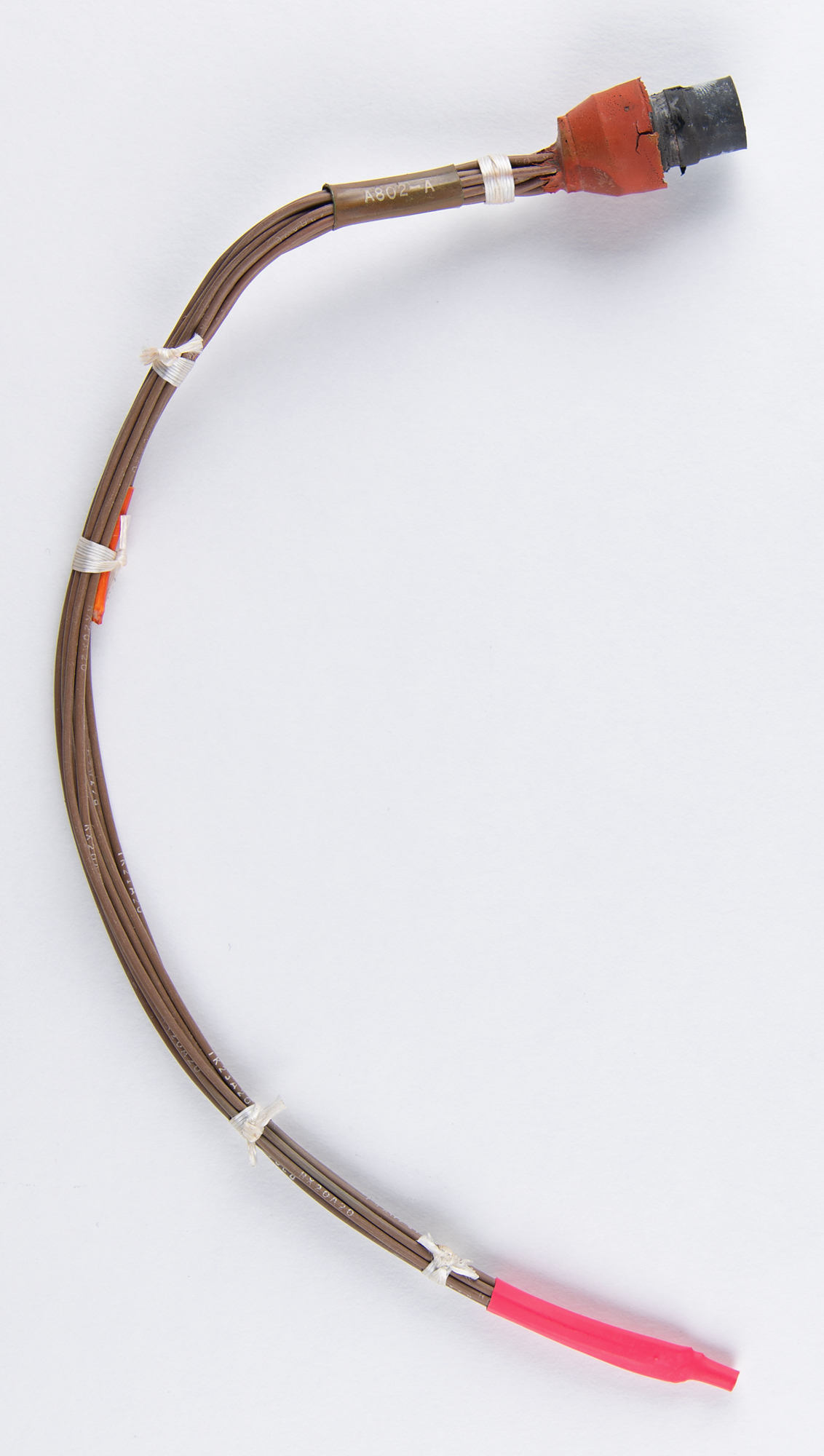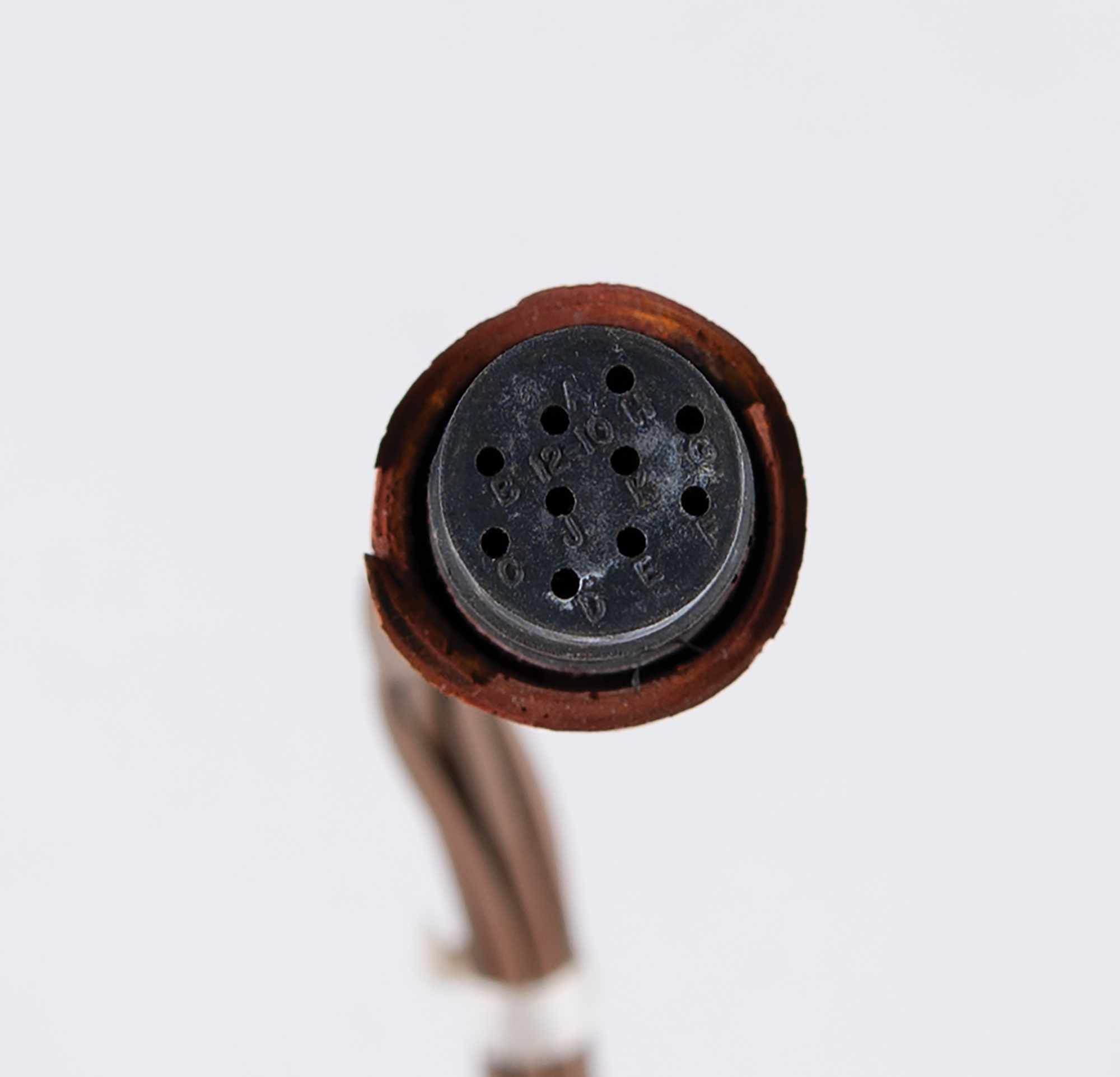 Flown 10-pin electrical connector deriving from the Liberty Bell 7, the spacecraft astronaut Gus Grissom piloted during the Mercury-Redstone 4 mission and that was recovered from the bottom of the Atlantic Ocean 38 years after splashdown. The 10-pin connector port measures .5˝ in diameter and its brown wire cluster extends to a length of 13˝, with rubber wrap near the port marked “A802-A.” In fine condition, with evidence of rusting to port and some wear to rubber cap.