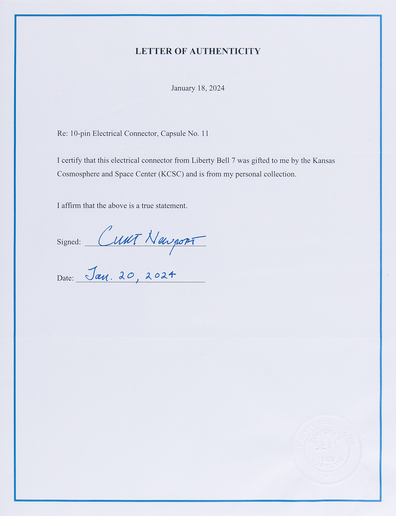 Accompanied by a signed letter of authenticity from Curt Newport, the team leader of the Liberty Bell 7 Recovery Expedition, who states: “I certify that this electrical connector from Liberty Bell 7 was gifted to me by the Kansas Cosmosphere and Space Center (KCSC) and is from my personal collection.”