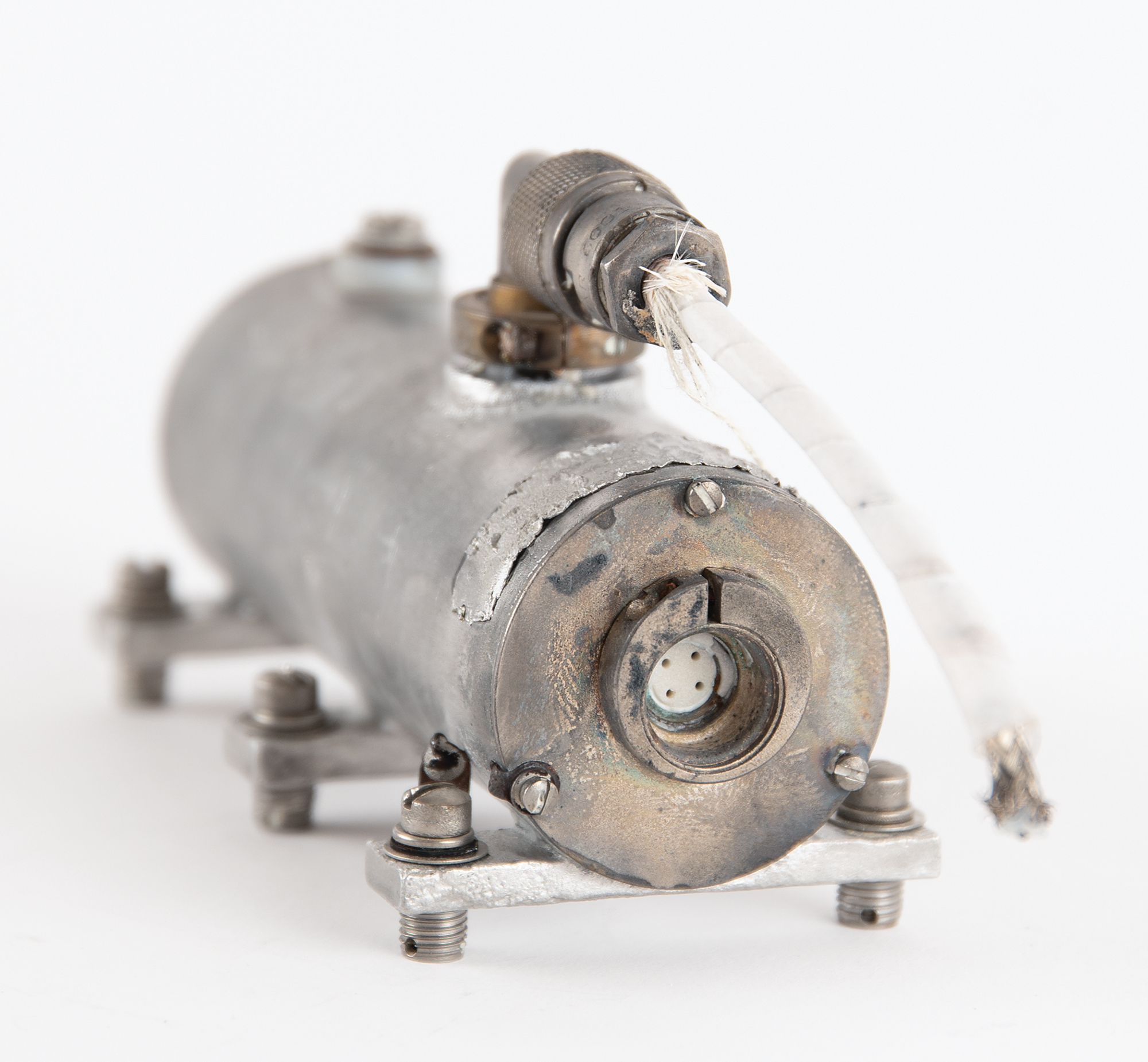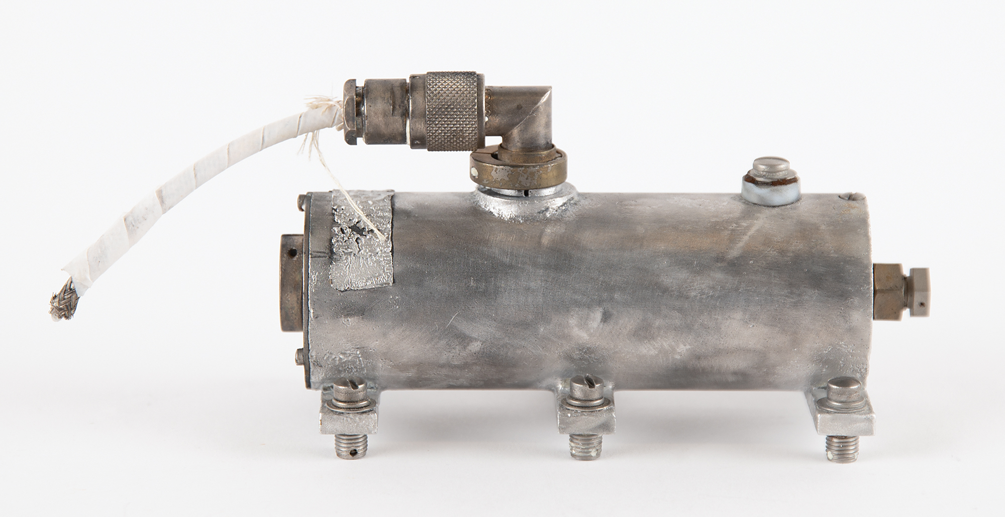 Flown RF (radio-frequency) module deriving from the Liberty Bell 7, the spacecraft astronaut Gus Grissom piloted during the Mercury-Redstone 4 mission and that was recovered from the bottom of the Atlantic Ocean 38 years after splashdown. The cylindrical aluminum module measures 2˝ x 5˝ x 2.5˝, with three mounting plates to the underside, an elbow fitting marked “GREMAR 6001,” with 2.5˝ length of coaxial cable, and ports to either end, one of which is stopped with a screw. In fine condition, with instances of scarring and marks.