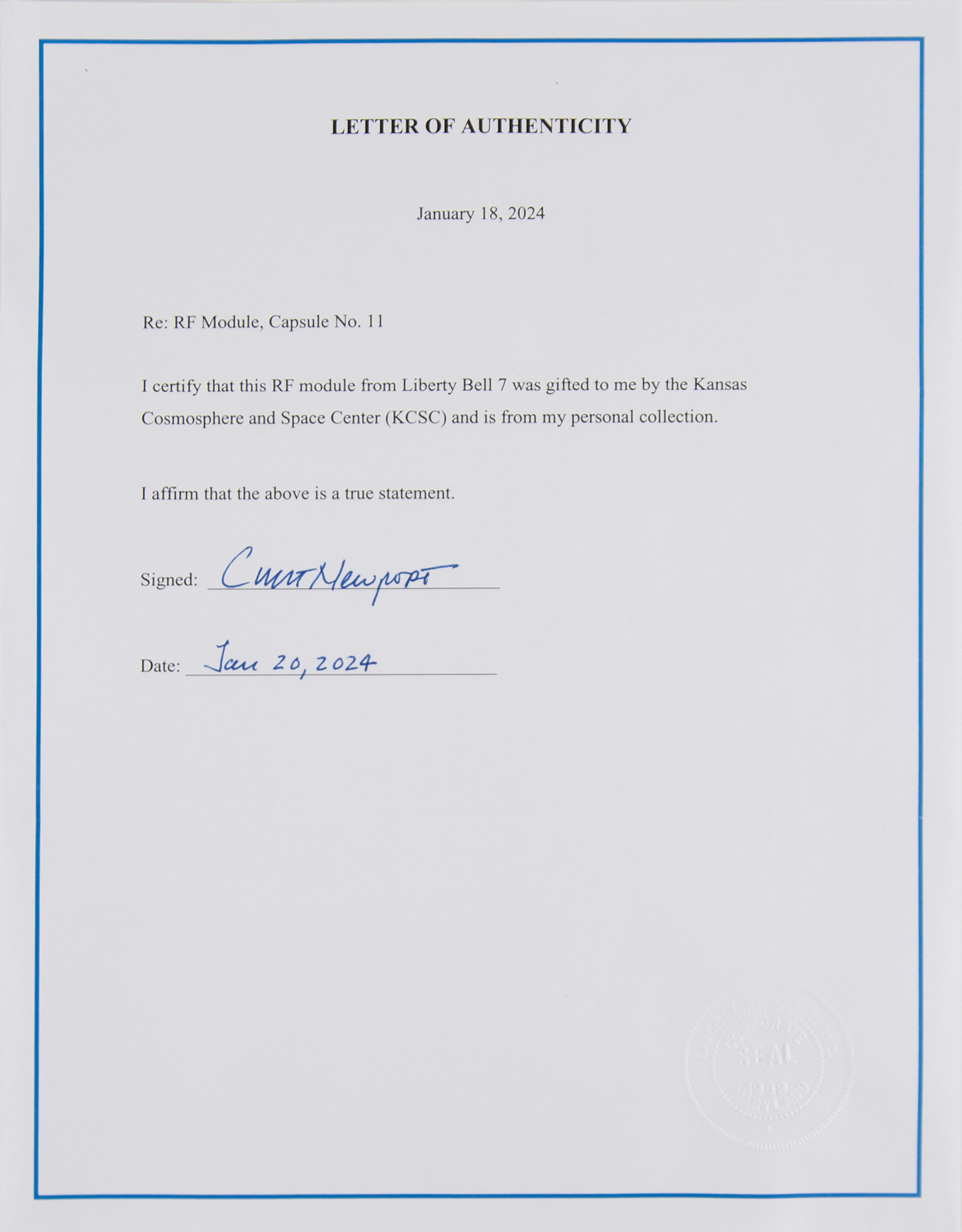 Accompanied by a signed letter of authenticity from Curt Newport, the team leader of the Liberty Bell 7 Recovery Expedition, who states: “I certify that this RF module from Liberty Bell 7 was gifted to me by the Kansas Cosmosphere and Space Center (KCSC) and is from my personal collection.”