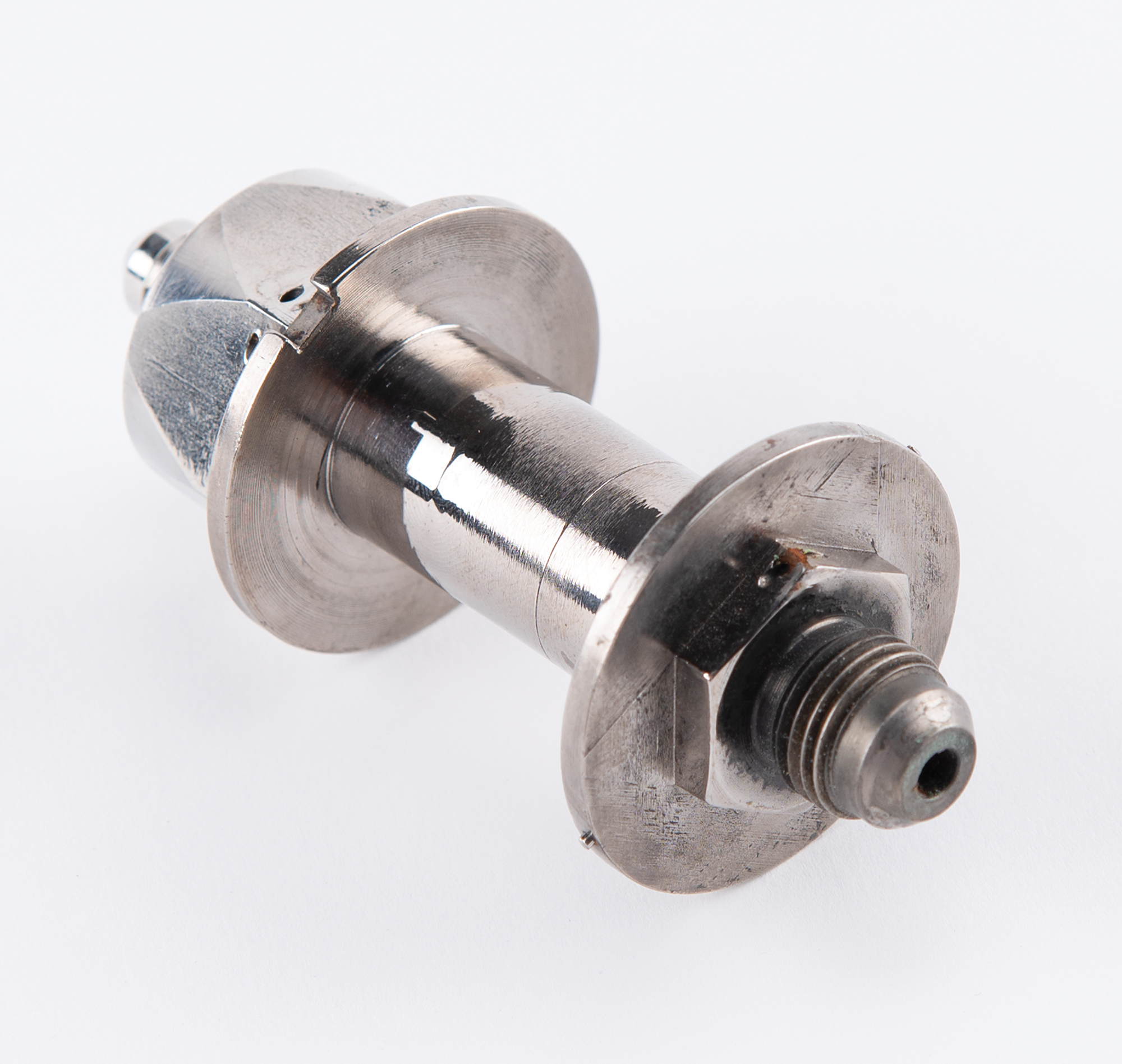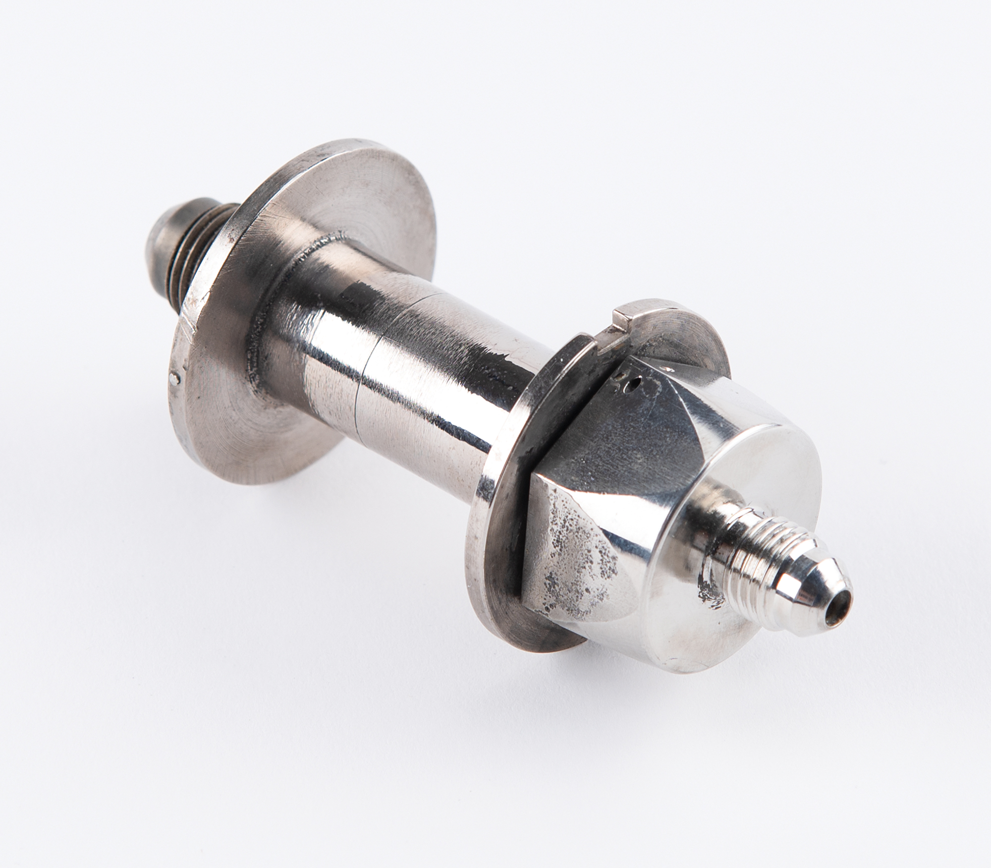 Flown hydraulic (or pneumatic) fitting deriving from the Liberty Bell 7, the spacecraft astronaut Gus Grissom piloted during the Mercury-Redstone 4 mission and that was recovered from the bottom of the Atlantic Ocean 38 years after splashdown. The dumbbell-shaped stainless steel fitting measures 3.75˝ in length and 1.5˝ in diameter, with threaded ports to either end. In fine condition.