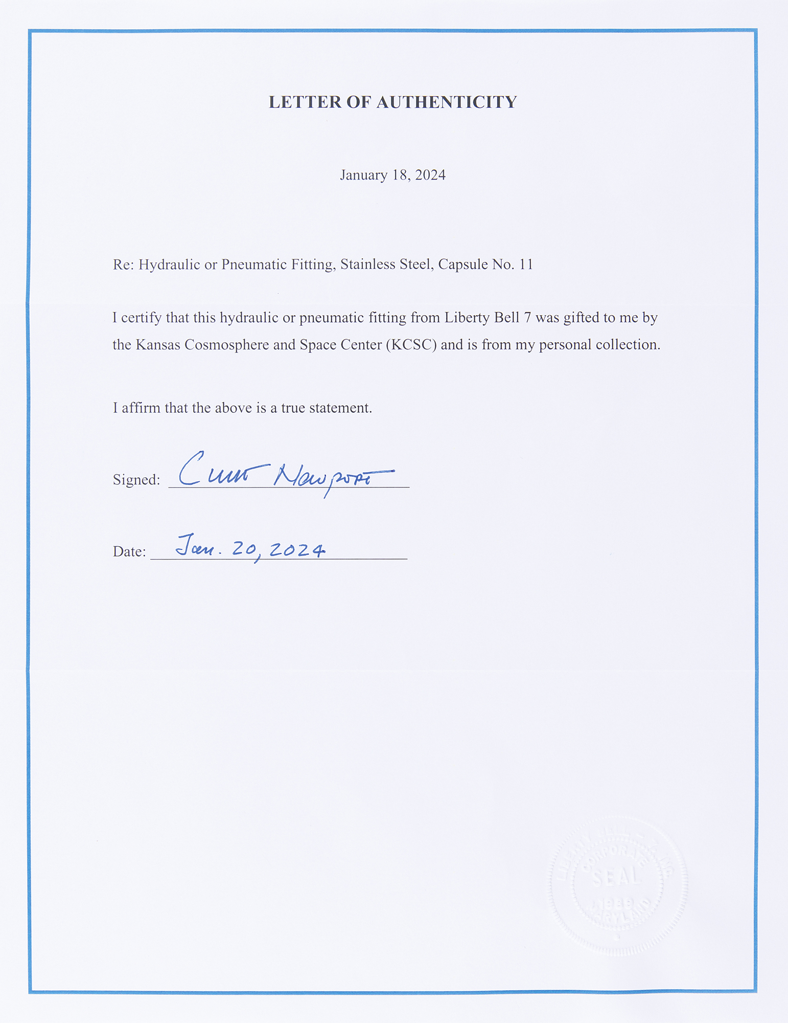 Accompanied by a signed letter of authenticity from Curt Newport, the team leader of the Liberty Bell 7 Recovery Expedition, who states: “I certify that this hydraulic or pneumatic fitting from Liberty Bell 7 was gifted to me by the Kansas Cosmosphere and Space Center (KCSC) and is from my personal collection.”