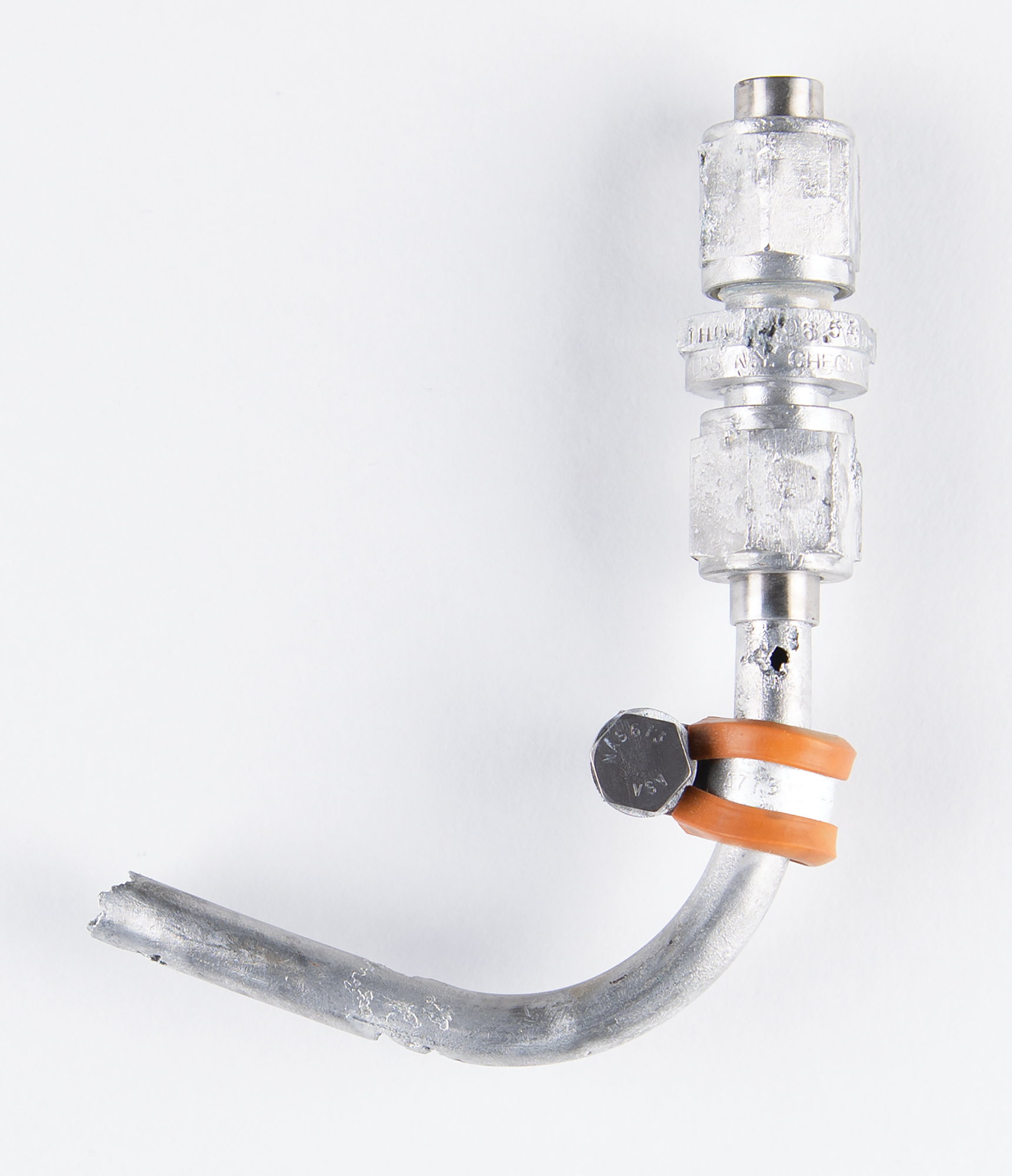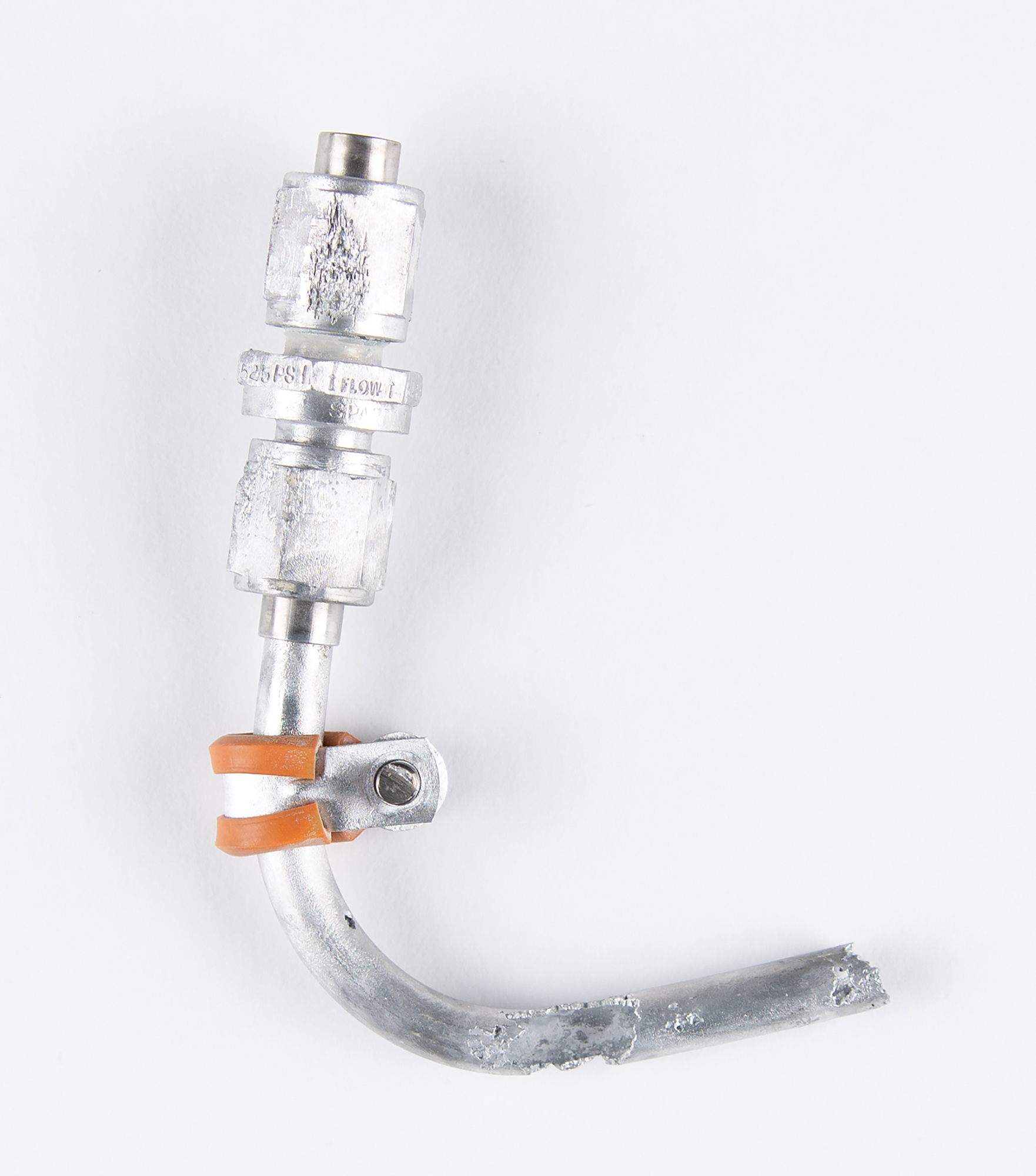 Flown elbow fitting deriving from the Liberty Bell 7, the spacecraft astronaut Gus Grissom piloted during the Mercury-Redstone 4 mission and that was recovered from the bottom of the Atlantic Ocean 38 years after splashdown. The curved fitting measures approximately 6.75˝ in length and ends with a “Check Valve” union marked “S/N 65, 525 PSI, Spartan, Yonkers, N.Y.” The piping section bears a sliding clamp. In fine condition, with noticeable corrosion to piping and union.