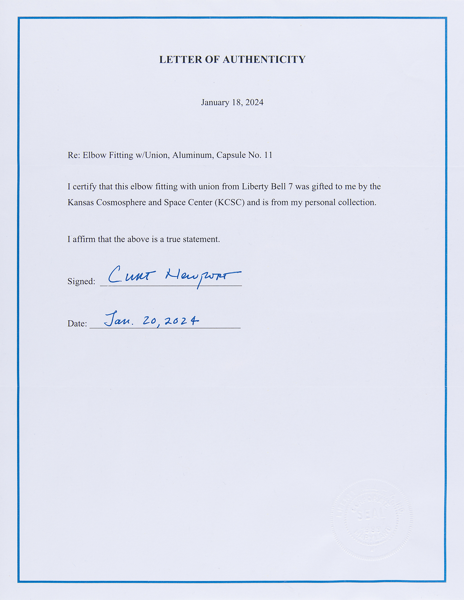 Accompanied by a signed letter of authenticity from Curt Newport, the team leader of the Liberty Bell 7 Recovery Expedition, who states: “I certify that this elbow fitting with union from Liberty Bell 7 was gifted to me by the Kansas Cosmosphere and Space Center (KCSC) and is from my personal collection.”
