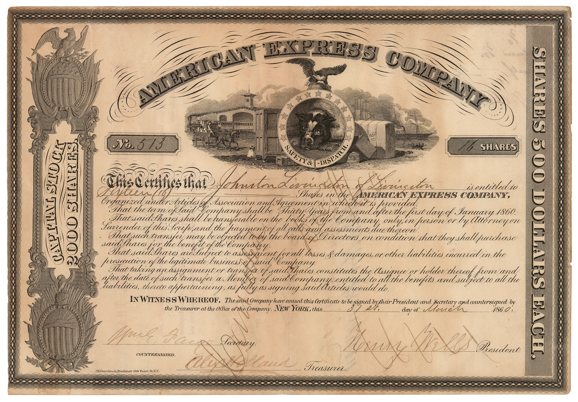 Partly-printed DS, signed “Henry Wells" and "Wm. G. Fargo,” one page, 11.5 x 8, March 31, 1860. Handsomely engraved stock certificate for 16 shares in the American Express Company, issued to Johnston Livingston. Signed at the conclusion by Henry Wells as president, William Fargo as secretary, and Alex Holland as treasurer. In fine condition, with slightly irregular faint toning.