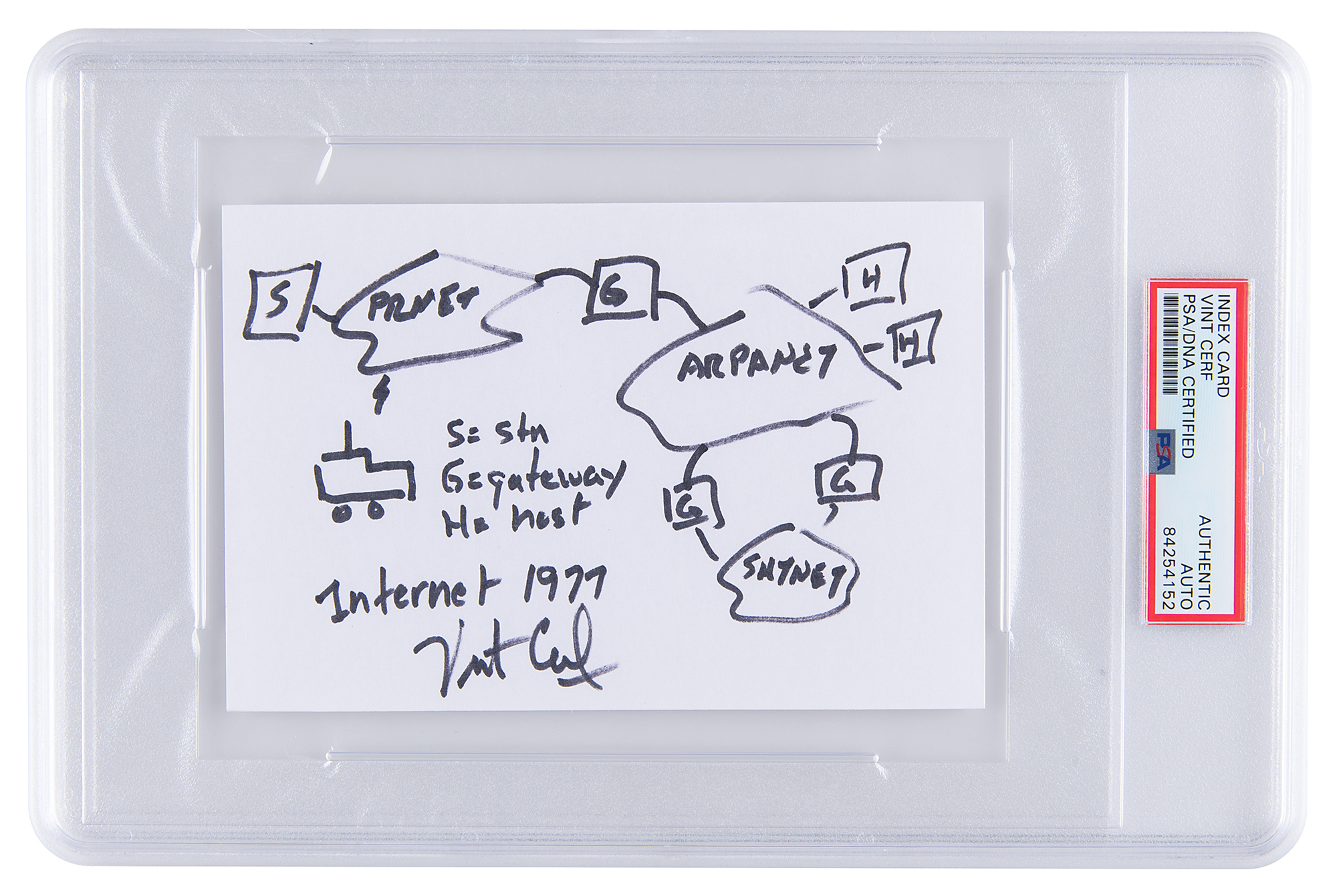 Original sketch by Vint Cerf of the “Internet 1977,” accomplished in black felt tip on a white 6 x 4 card, signed at the bottom, "Vint Cerf." The sketch shows a basic diagram of the connections between gateways, hosts, and networks. In very fine condition. Encapsulated in a PSA/DNA authentication holder.