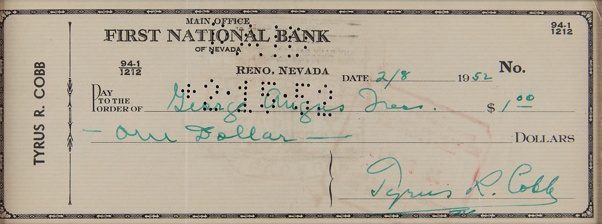 Personal check, 8 x 3, filled out and signed in green ink by Cobb, "Tyrus R. Cobb," payable to George Angus for $1, February 8, 1952. Nicely cloth-matted and framed with an engraved plaque and photo to an overall size of 20.75 x 15.25. In fine condition, with one vertical fold.
