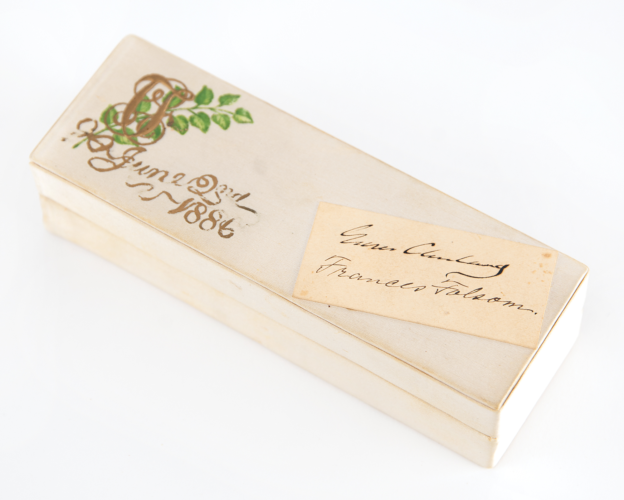 In the entire history of the United States, Grover Cleveland is the only president to have gotten married in the White House. The ceremony took place in the Blue Room on June 2, 1886, and saw the 49-year-old Cleveland wed his 21-year-old bride, Frances Folsom. Although the wedding was highly publicized, only close associates of the bride and groom were permitted to attend the ceremony. Supper was held in the East Room: the centerpiece was a model ship made of flowers, flying the national colors and flags bearing the initials 'CF.' Slices of wedding cake were given to the guests in individual satin boxes with cards signed by the bride and groom—this being one such example.