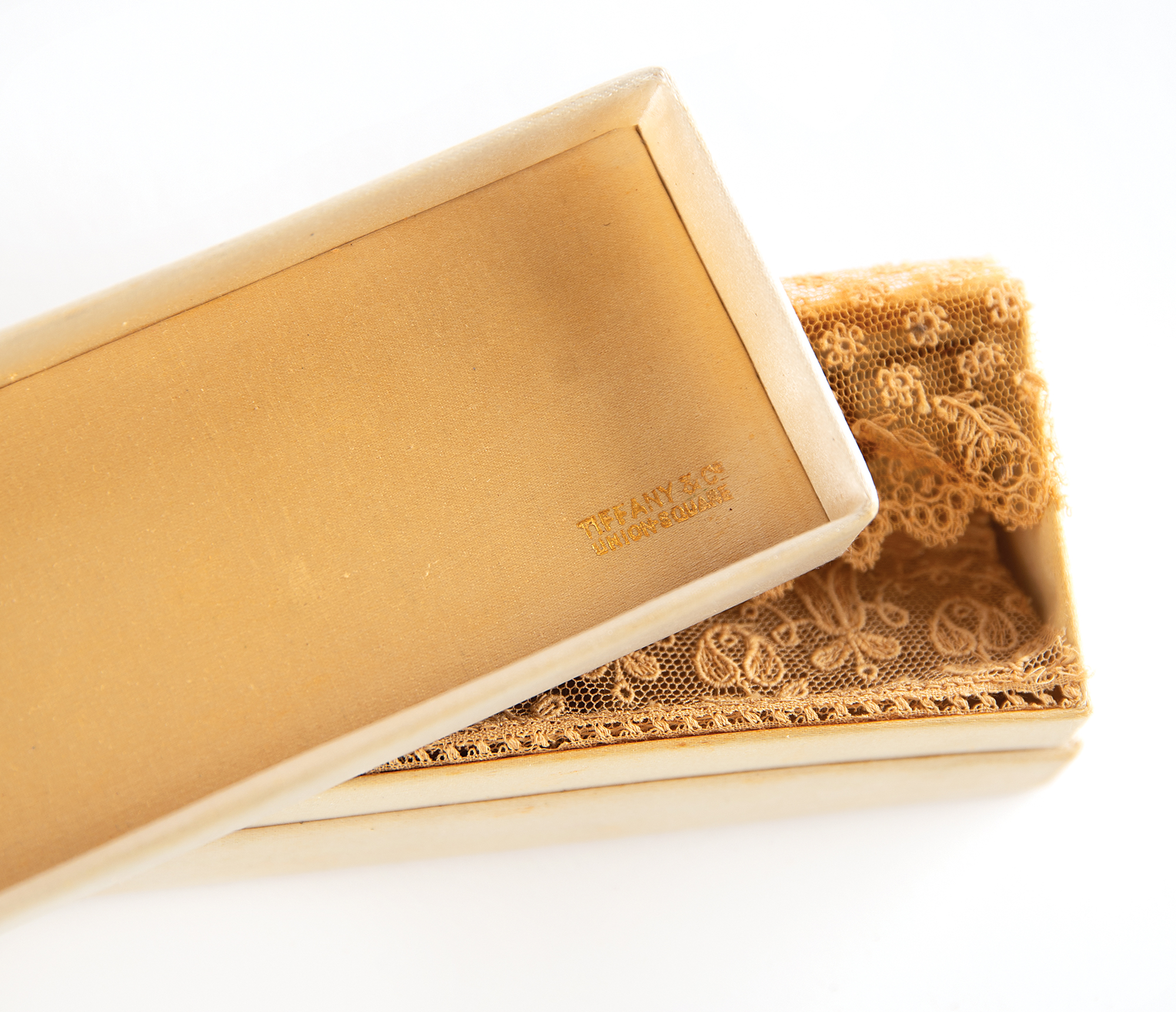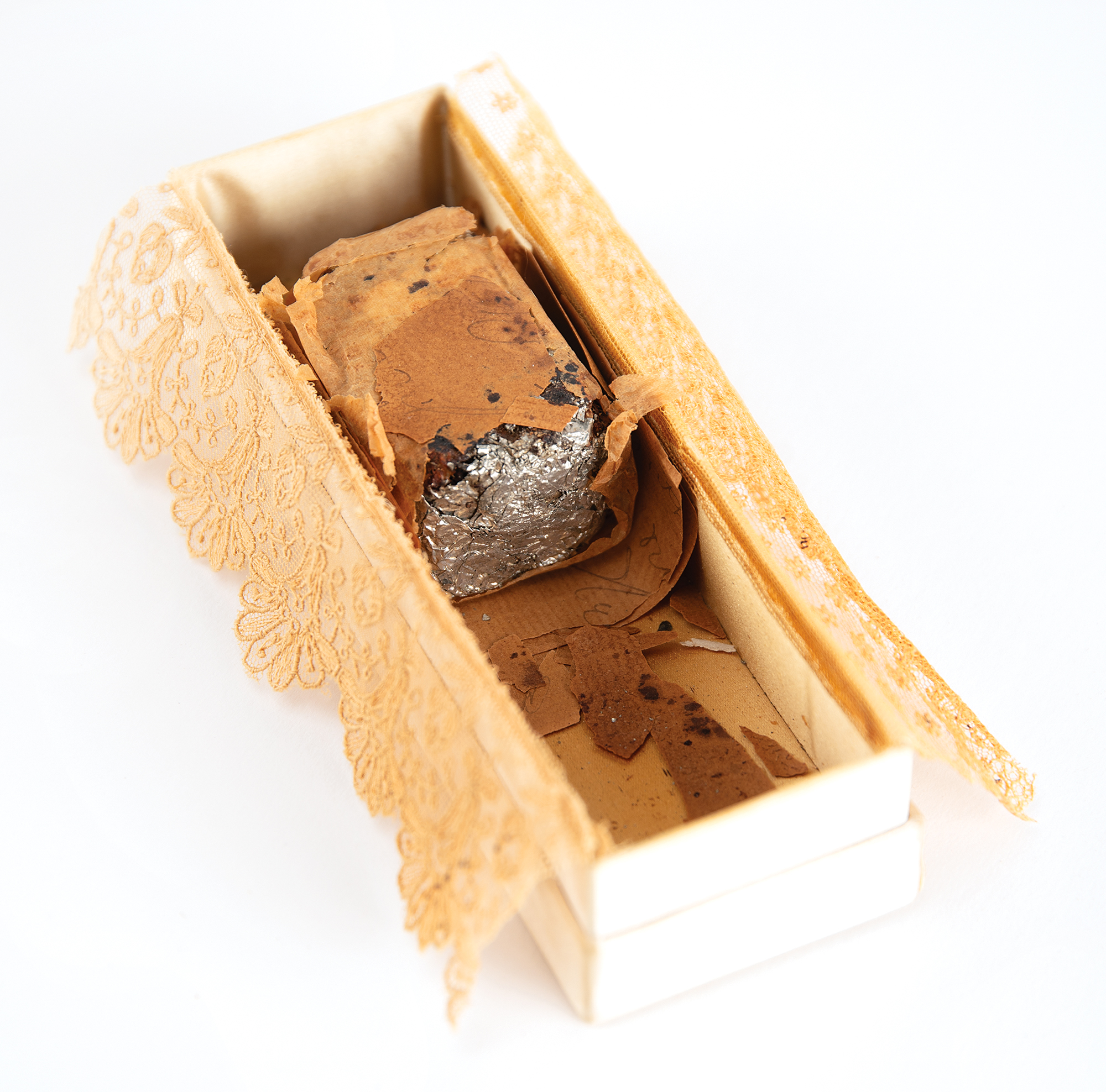 Rare slice of cake from the wedding of Grover Cleveland and Frances Folsom, held on June 2, 1886, in its original 6.25˝ x 2˝ x 1.5˝ box, bearing an affixed card signed in bold ink by the newlyweds, "Grover Cleveland" and "Frances Folsom." The decorative silk box, made by Tiffany & Co., is emblazoned with the date, "June 2nd, 1886," and a floral ornament. The partial piece of dense, sugary fruitcake inside, measuring approximately 1.25˝ x 2˝ x 1.25˝, is wrapped in tinfoil and the original doily. In very good to fine condition.