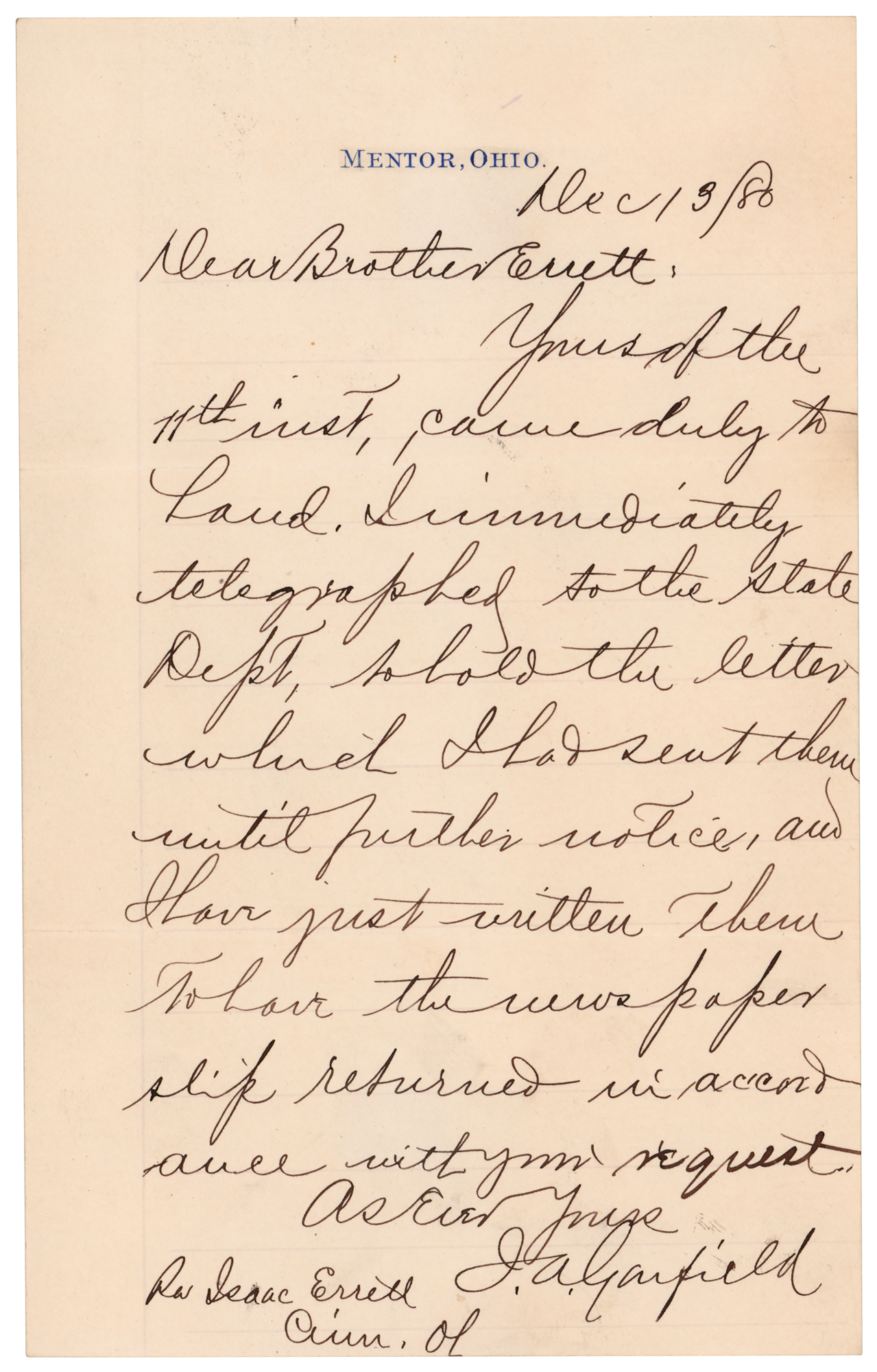 LS as president-elect, signed “J. A. Garfield,” one page, 5 x 8, Mentor, Ohio letterhead, December 13, 1880. Letter to noted Disciples of Christ clergyman Isaac Errett, in full: "Yours of the 11th inst, came duly to hand. I immediately telegraphed to the state Dept, to hold the letter which I had sent them until further notice, and I have just written them to have the newspaper slip returned in accordance with your request." In fine condition. Accompanied by an unsigned matte-finish photo. Garfield had been elected to the presidency on November 2, 1880, and would take office on March 4, 1881. Reverend Errett was a longtime friend of Garfield and delivered the eulogy at the fallen president's funeral in Cleveland on September 26, 1881.