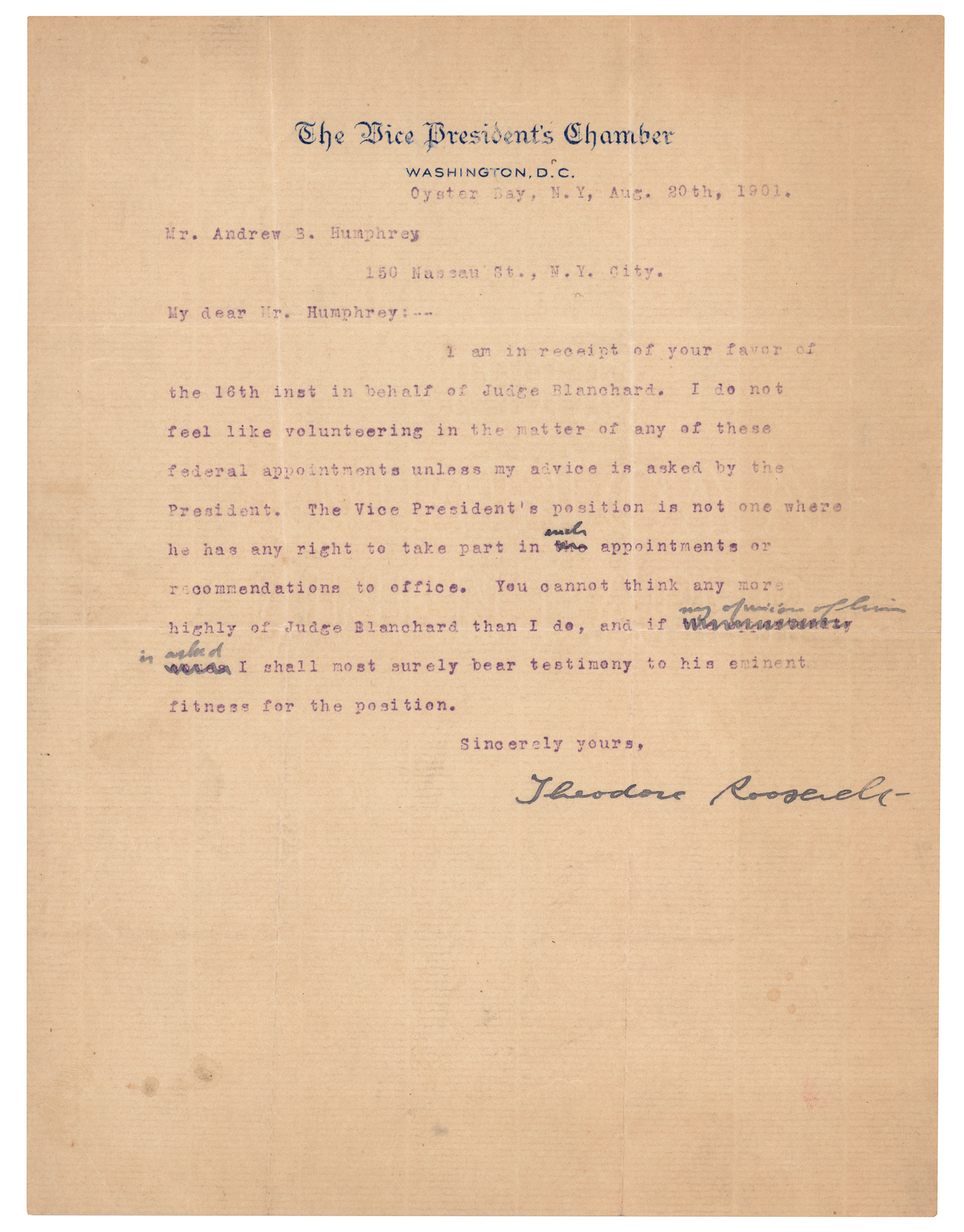 Scarce TLS as vice president, one page, 7.75 x 10.25, The Vice President's Chamber letterhead, August 20, 1901. Letter to Andrew S. Humphrey in New York, in full: "I am in receipt of your favor of the 16th inst. in behalf of Judge Blanchard. I do not feel like volunteering in the matter of any of these federal appointments unless my advice is asked by the President. The Vice President's position is not one where he has any right to take part in such appointments or recommendations to office. You cannot think any more highly of Judge Blanchard than I do, and if my opinion of him is asked I shall most surely bear testimony to his eminent fitness for the position." Roosevelt makes several handwritten revisions to the text, writing in seven words. In fine condition, with uniform toning. Excellent content from Roosevelt exemplifying his respect for his office, and a rarity as he was vice president for a mere six months—when President McKinley died less than a month later, on September 14, 1901, Roosevelt rose to the nation's highest office.