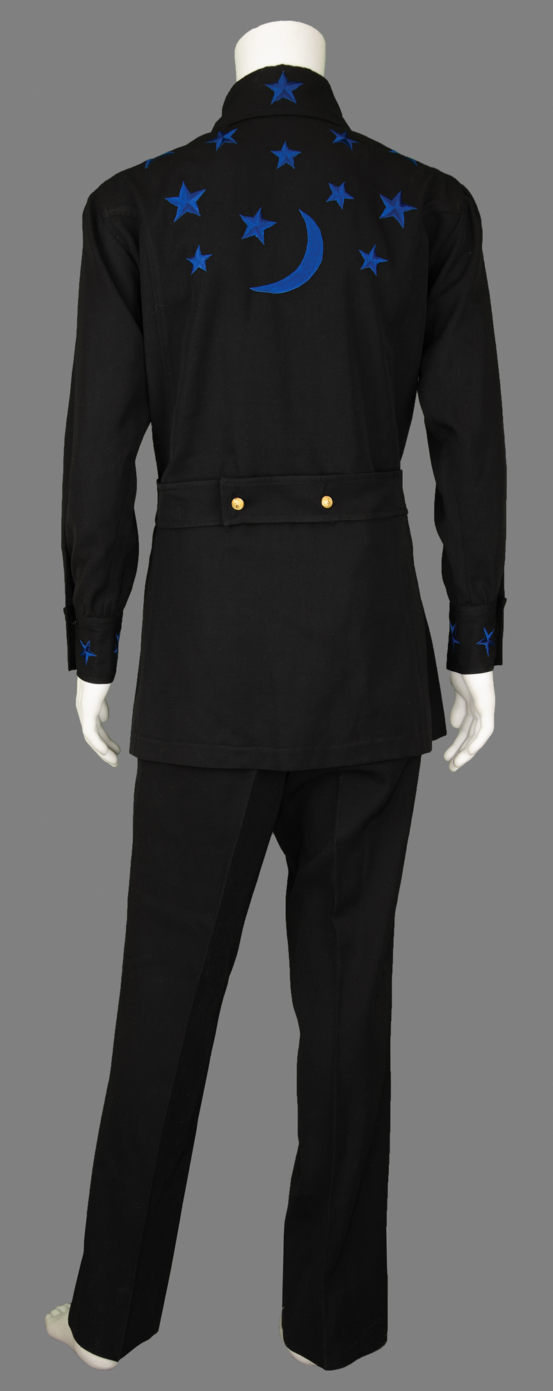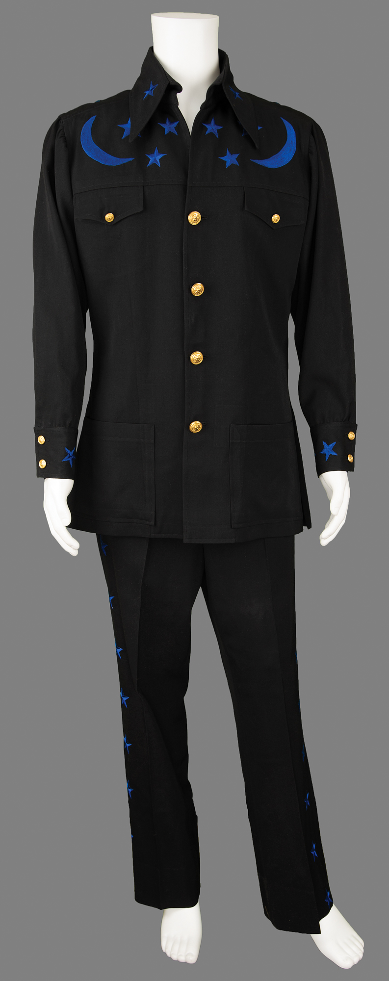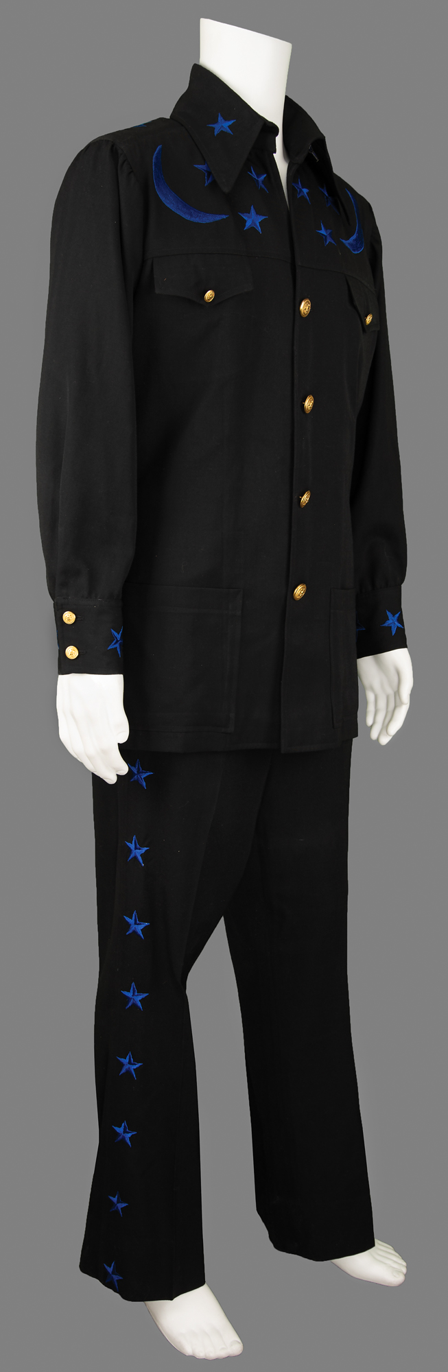 Johnny Cash's custom-made outfit by Nudie's Rodeo Tailors of North Hollywood, California, featuring black pants and a black jacket, both embroidered in navy blue with decorative details. The jacket is embroidered with moons and stars on the chest, back, cuffs, and collar, and features a fiddle back, golden buttons, belt sewn in the back, and patch pockets on the front, with the Nudie's tags sewn inside, labeled: "Name: Johnny Cash, Date: 1-17-77." The matching pants have blue stars down the sides, a zippered fly with button/clasp closure, front pockets, and no back pockets, with Nudie's tags sewn inside the waist, labeled: "Name: Johnny Cash, Date: 1-17-77, Size: 38-35." In fine condition.