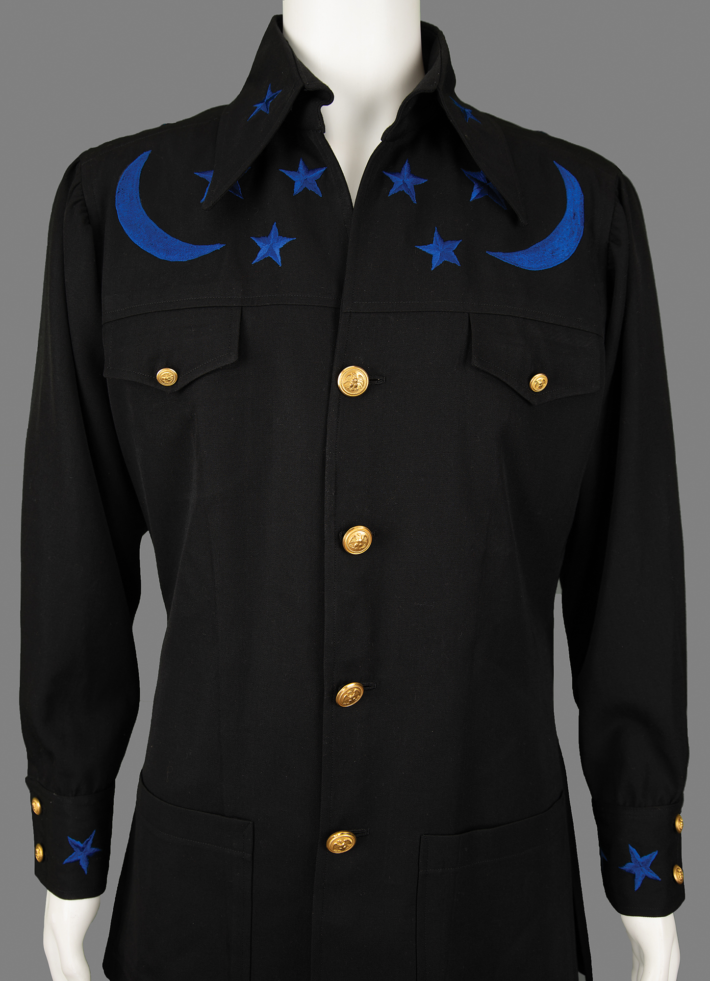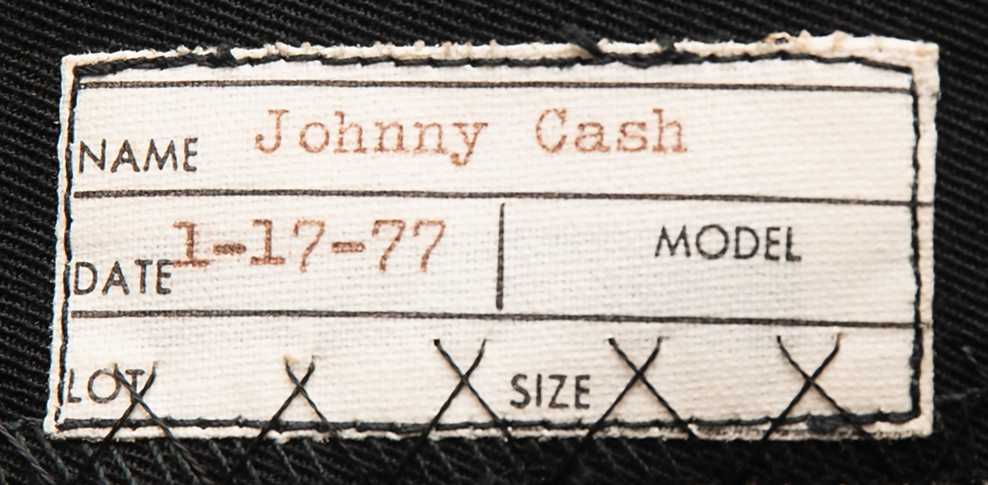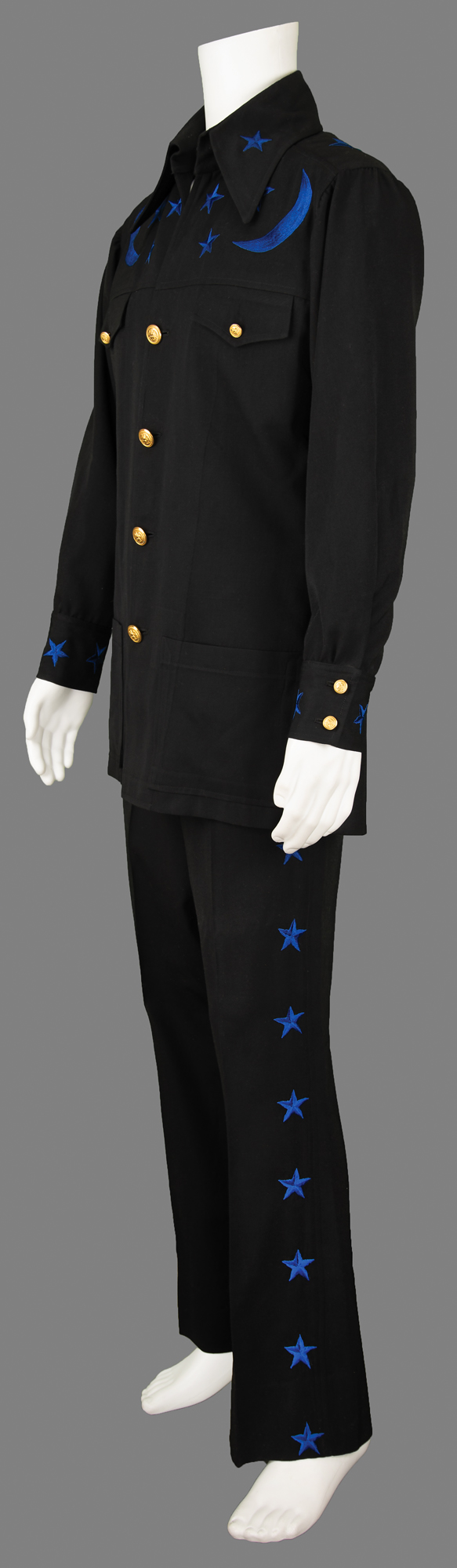 Johnny Cash's custom-made outfit by Nudie's Rodeo Tailors of North Hollywood, California, featuring black pants and a black jacket, both embroidered in navy blue with decorative details. The jacket is embroidered with moons and stars on the chest, back, cuffs, and collar, and features a fiddle back, golden buttons, belt sewn in the back, and patch pockets on the front, with the Nudie's tags sewn inside, labeled: "Name: Johnny Cash, Date: 1-17-77." The matching pants have blue stars down the sides, a zippered fly with button/clasp closure, front pockets, and no back pockets, with Nudie's tags sewn inside the waist, labeled: "Name: Johnny Cash, Date: 1-17-77, Size: 38-35." In fine condition.