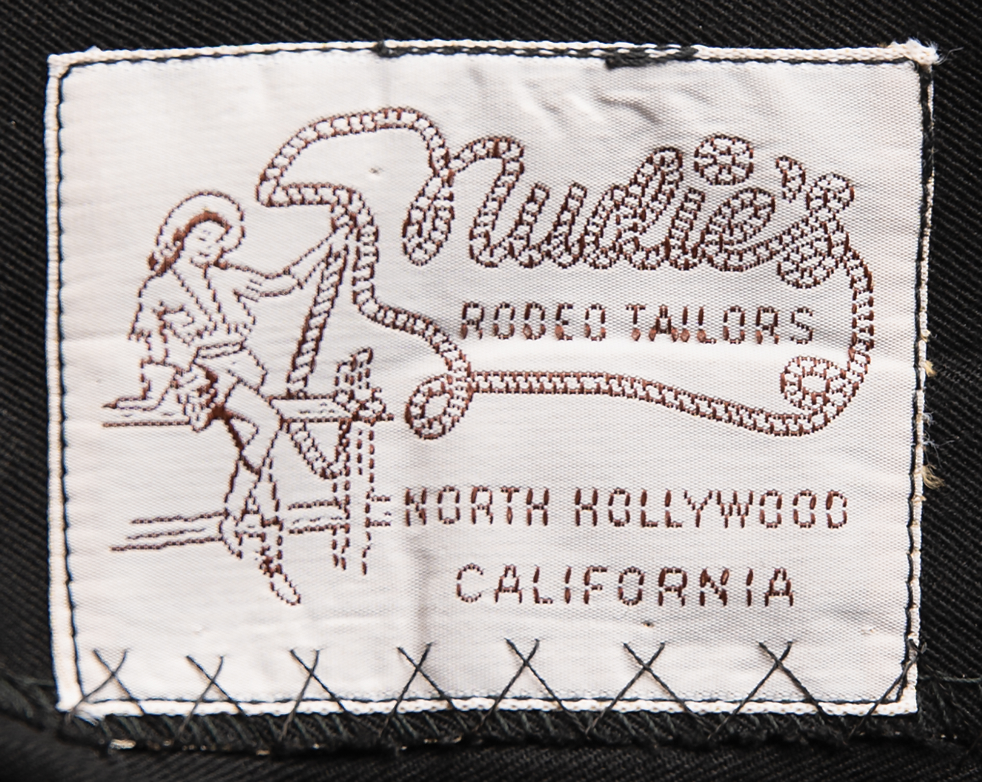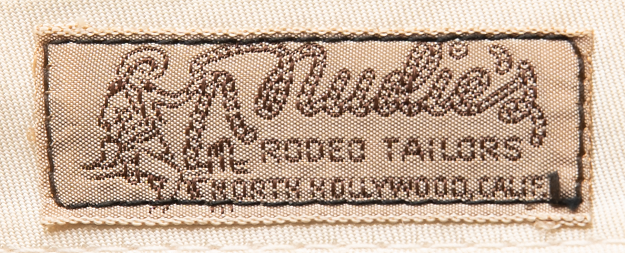 Accompanied by a color copy of a Johnny Cash order form (dated "1-16-77") from Nudie's Rodeo Tailors Archives, part of the collection of the Autry Museum of the American West. The form calls for "6 black gab shirt jackets and pants," including "1 outfit with half moon and silver stars," "2 outfits blue stars," "2 outfits silver stars," "1 outfit silver and blue stars," with the other specifications called for largely corresponding to the present outfit.