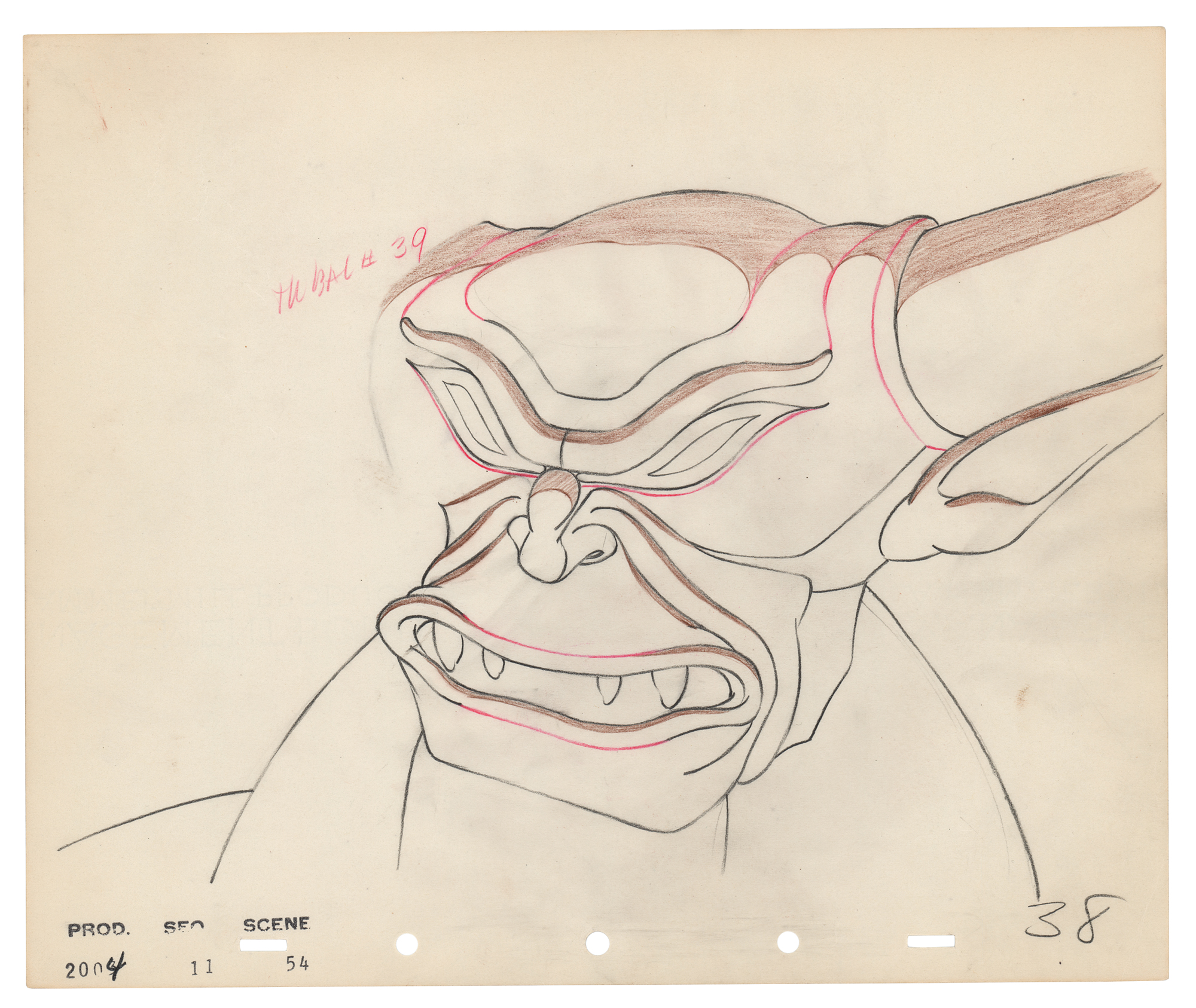 (Walt Disney Studios, 1940) Original production drawing of the Chernabog from Fantasia, showing the imposing demon in a ferocious up-close pose during the terrifying 'Night on Bald Mountain' sequence. Accomplished in graphite and colored pencil on untrimmed 12 x 10 animation paper marked "38" in the lower right corner; the lower left corner is stamped “Prod. 2004, Seq. 11, Scene 54.” Image measures 11.5 x 7.75. In fine condition.