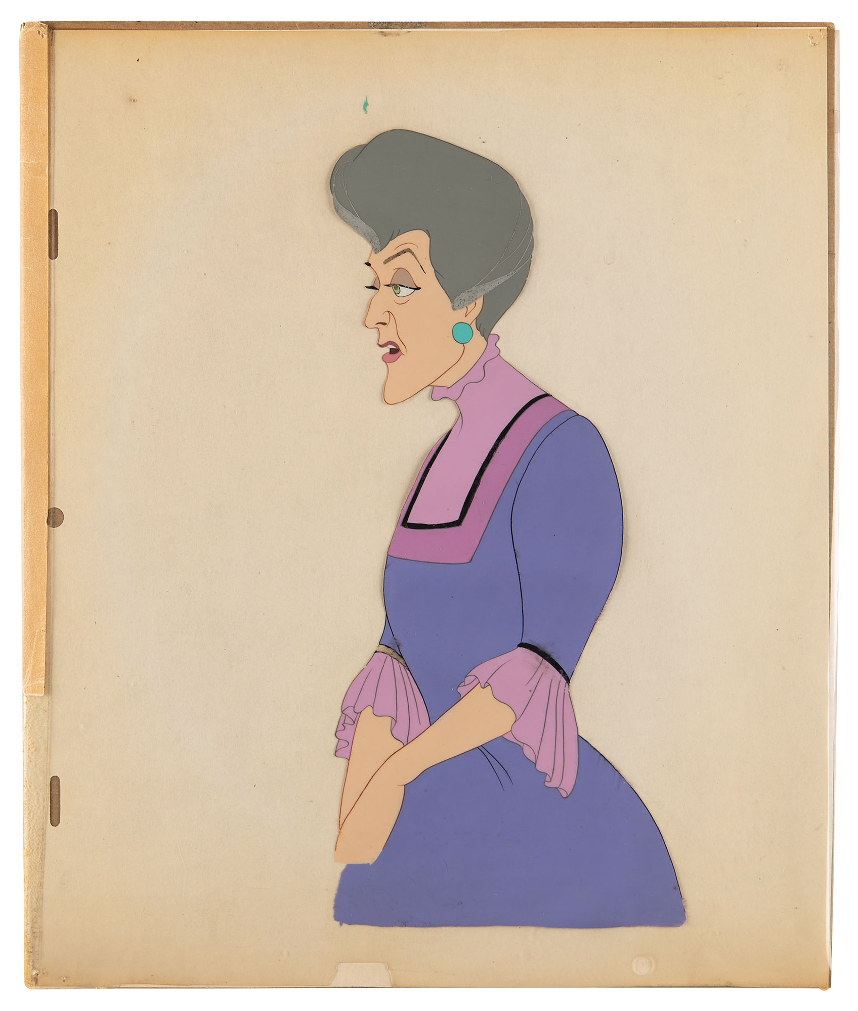 (Walt Disney Studios, 1950) Original production cel of the Wicked Stepmother from Cinderella, portraying Lady Tremaine in an exquisite three-quarter-length profile pose. Image measures 4.5 x 9.75, with overall dimensions of 10 x 12. In very good to fine condition, with a fold to right side, chip to bottom edge, and a few pin holes, all of which could be matted out if so desired. A large and bright production cel from this uncommon Cinderella villain.