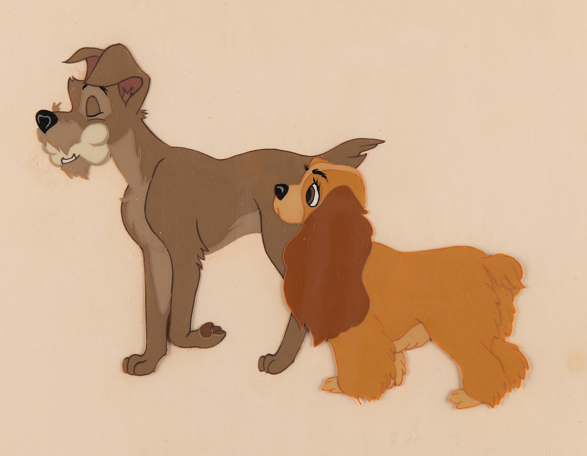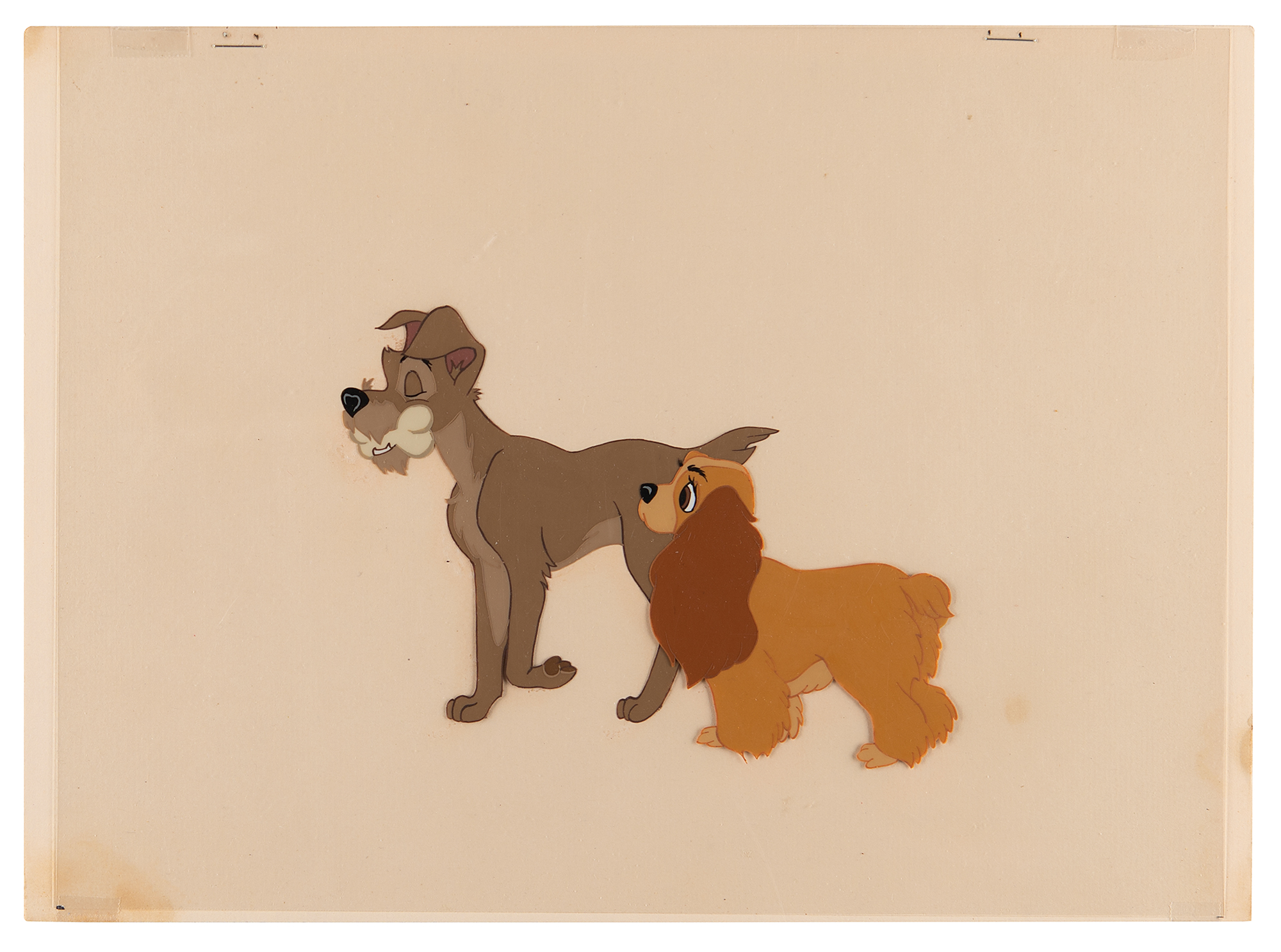 (Walt Disney Studios, 1955) Original production cels of the title stars from the Disney classic Lady and the Tramp, showing the two romantic canines in wonderful full-length walking poses. Total character image measures 6 x 4.25, with overall dimensions of 12 x 8.75. The cels are slightly trimmed and in fine condition.