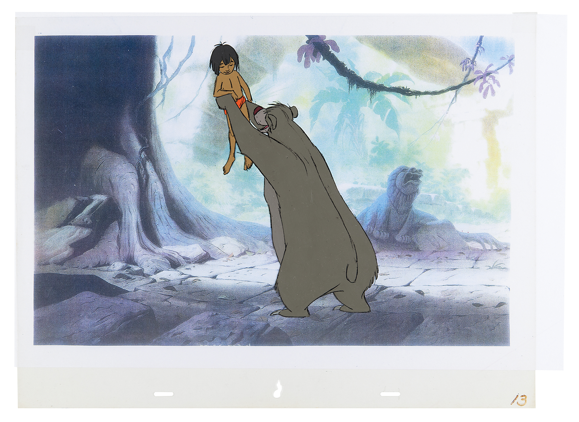 (Walt Disney Studios, 1967) Original production cel featuring Mowgli and Baloo from The Jungle Book, which depicts the 'man-cub' being picked up by his sloth bear teacher. Image measures 5 x 8.5, with overall dimensions of 17 x 12. The cel, which is marked "13" in the lower right corner, is placed upon a color copy background. In fine condition. After a lukewarm reaction to his studio's last film, The Sword in the Stone, Disney took a more prevalent role in the story and design of The Jungle Book, which would be the last film to include Disney's personal input and touches, with Disney passing away before the film's premiere.
