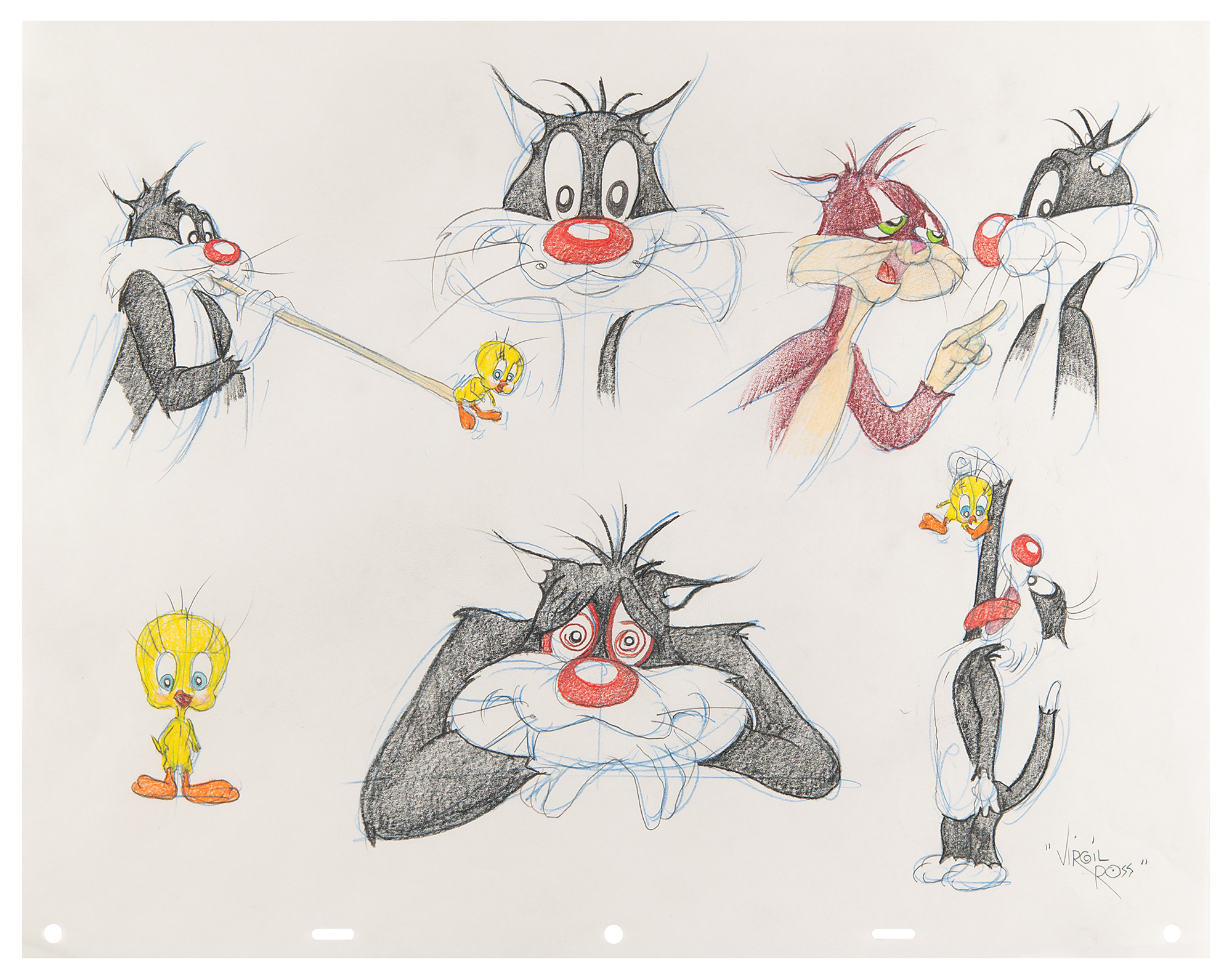 (Warner Brothers Studios, circa 1990s) Original color model drawing by Virgil Ross featuring Sylvester the Cat and Tweety Bird, showing the latter in three different poses and the former in five, one of which depicts him with Clarence the Cat, images inspired by the 1957 Oscar-winning short Birds Anonymous. Accomplished in graphite and colored pencil on untrimmed 17 x 13.5 animation paper, signed at the bottom in pencil, "Virgil Ross." In fine condition. This drawing was done to be sold in the Warner Brothers Studio stores in the 1990s.