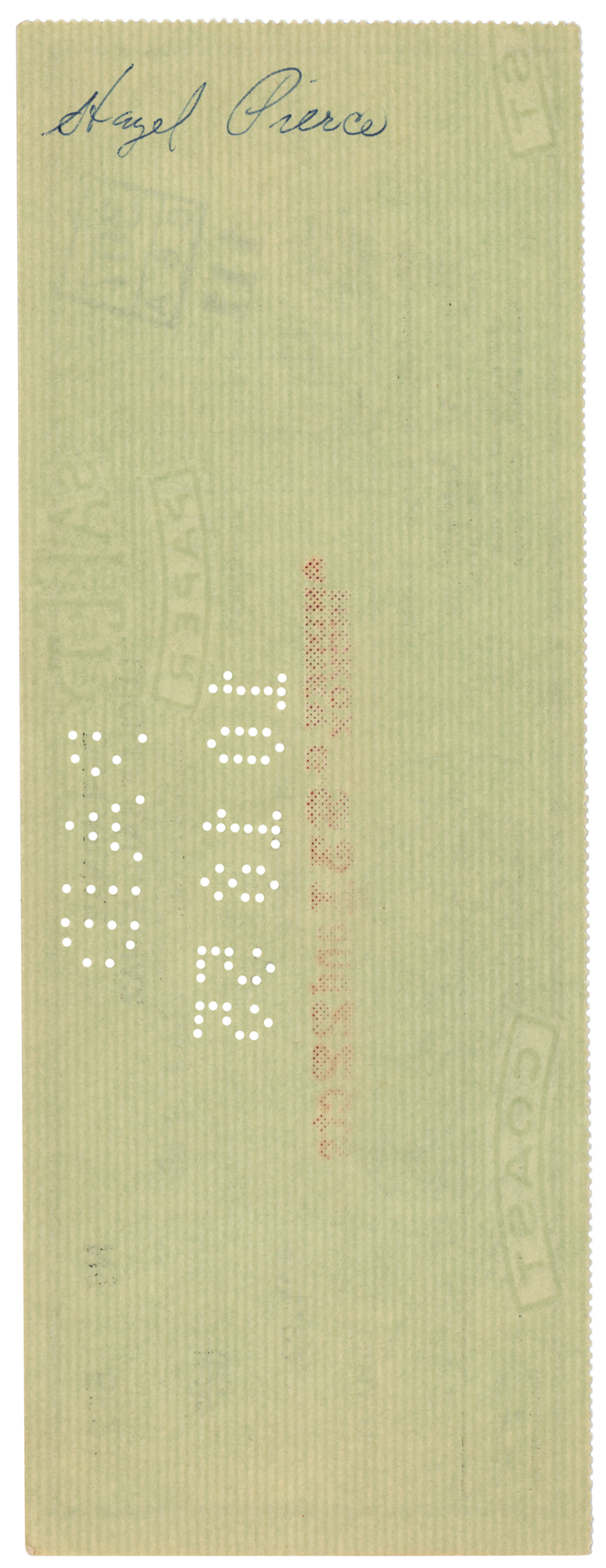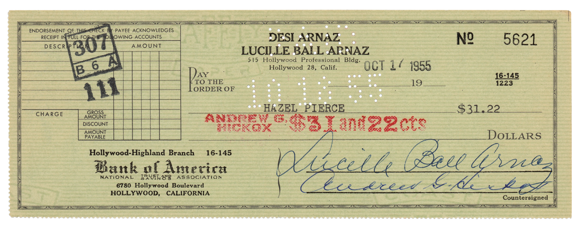 Personal check, 8.25 x 3, filled out in type and signed by Ball, "Lucille Ball Arnaz," payable to Hazel Pierce for $31.22, stamp-dated October 17, 1955, and endorsed by Pierce on the reverse. In fine condition. Hazel Pierce (1896–1987) was a longtime friend of Lucille Ball, appearing as an extra in countless background party scenes on the TV show 'I Love Lucy.'