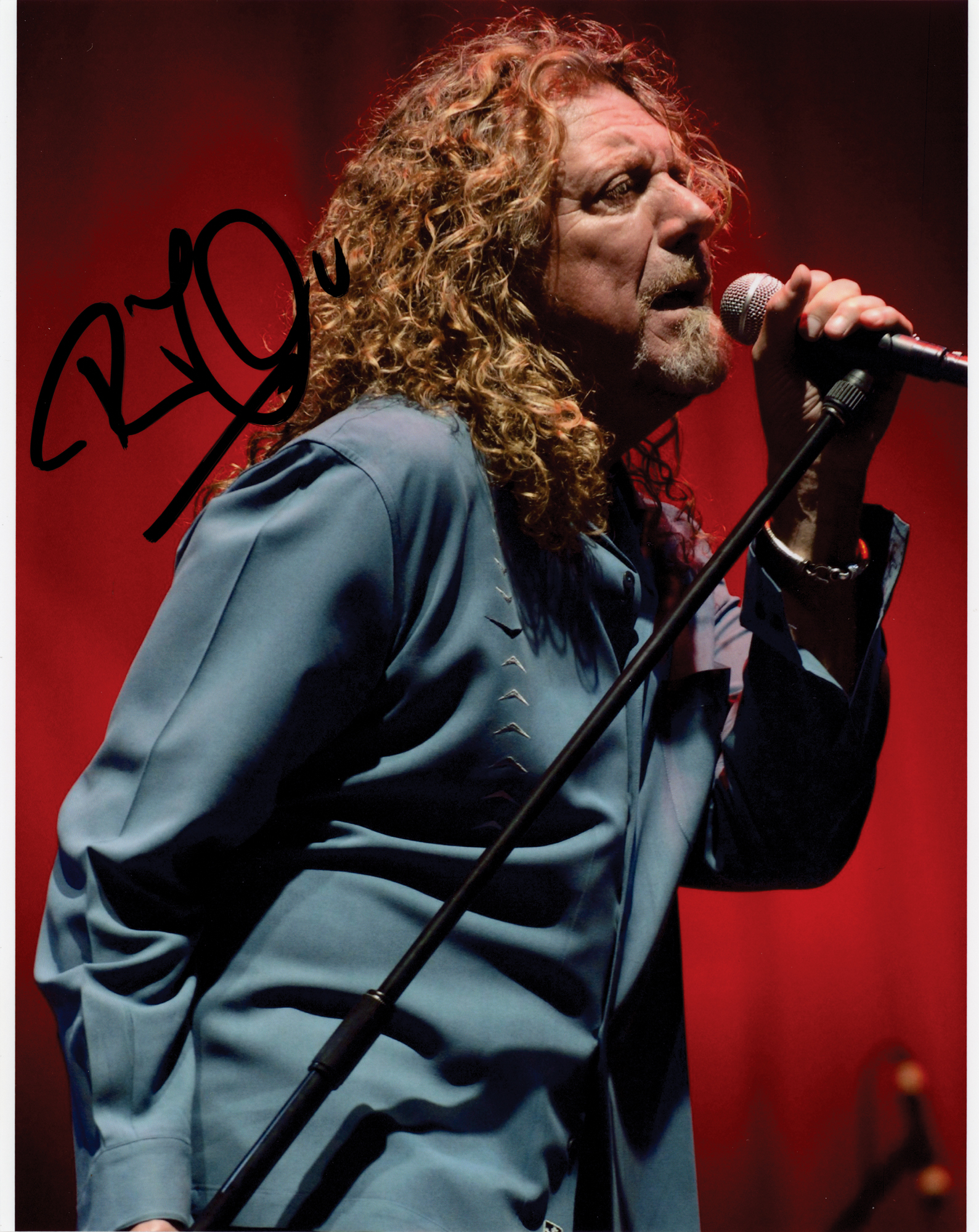 Color glossy 8 x 10 photo of Robert Plant performing live against a red backdrop, signed in black felt tip. In fine condition, with a few small surface creases. Accompanied by a letter of authenticity stating that the signature was obtained in Cork, Ireland in 2014.