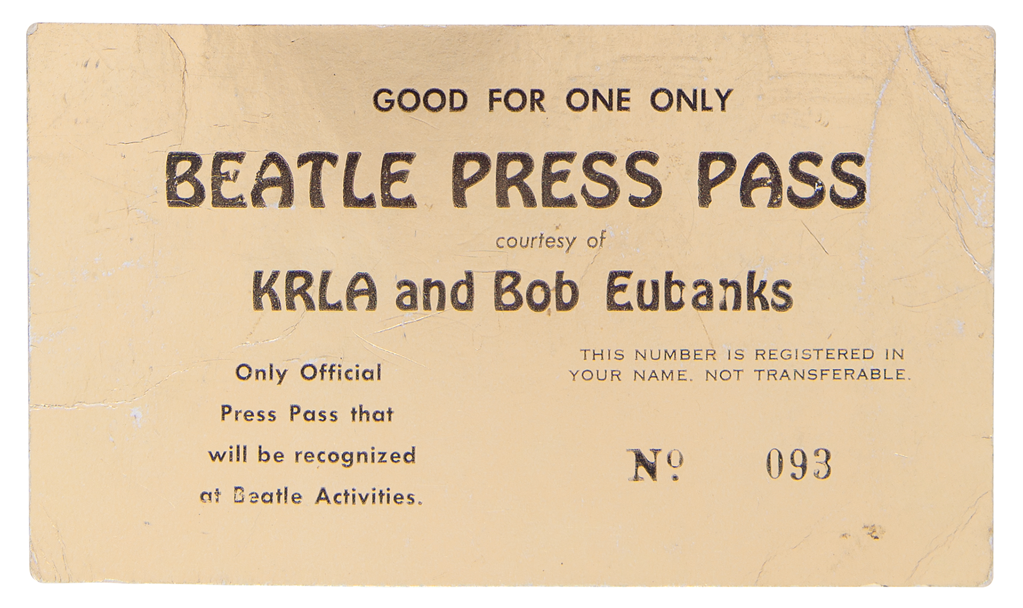 Scarce golden 5.25 x 3 press pass issued for the press events affiliated with the Beatles concerts at the Hollywood Bowl, August 29–30, 1965, imprinted: "Good for One Only, Beatle Press Pass, Courtesy of KRLA and Bob Eubanks, Only Official Press Pass that will be recognized at Beatle Activities." The pass is stamped as "No. 093," with a warning: "This number is registered to your name, not transferable." In very good condition, with overall creasing and some tape stains, with associated surface loss, to the blank reverse.