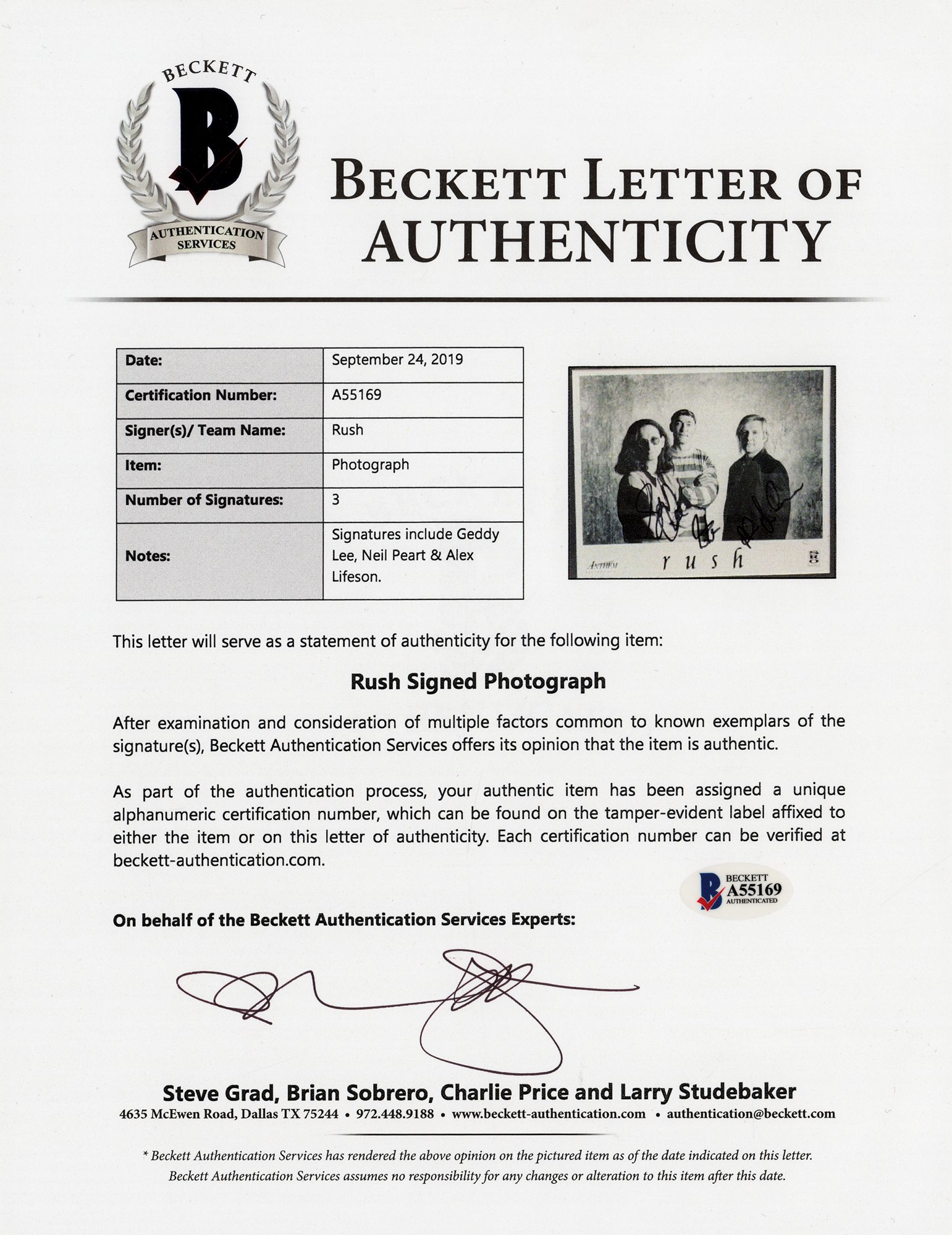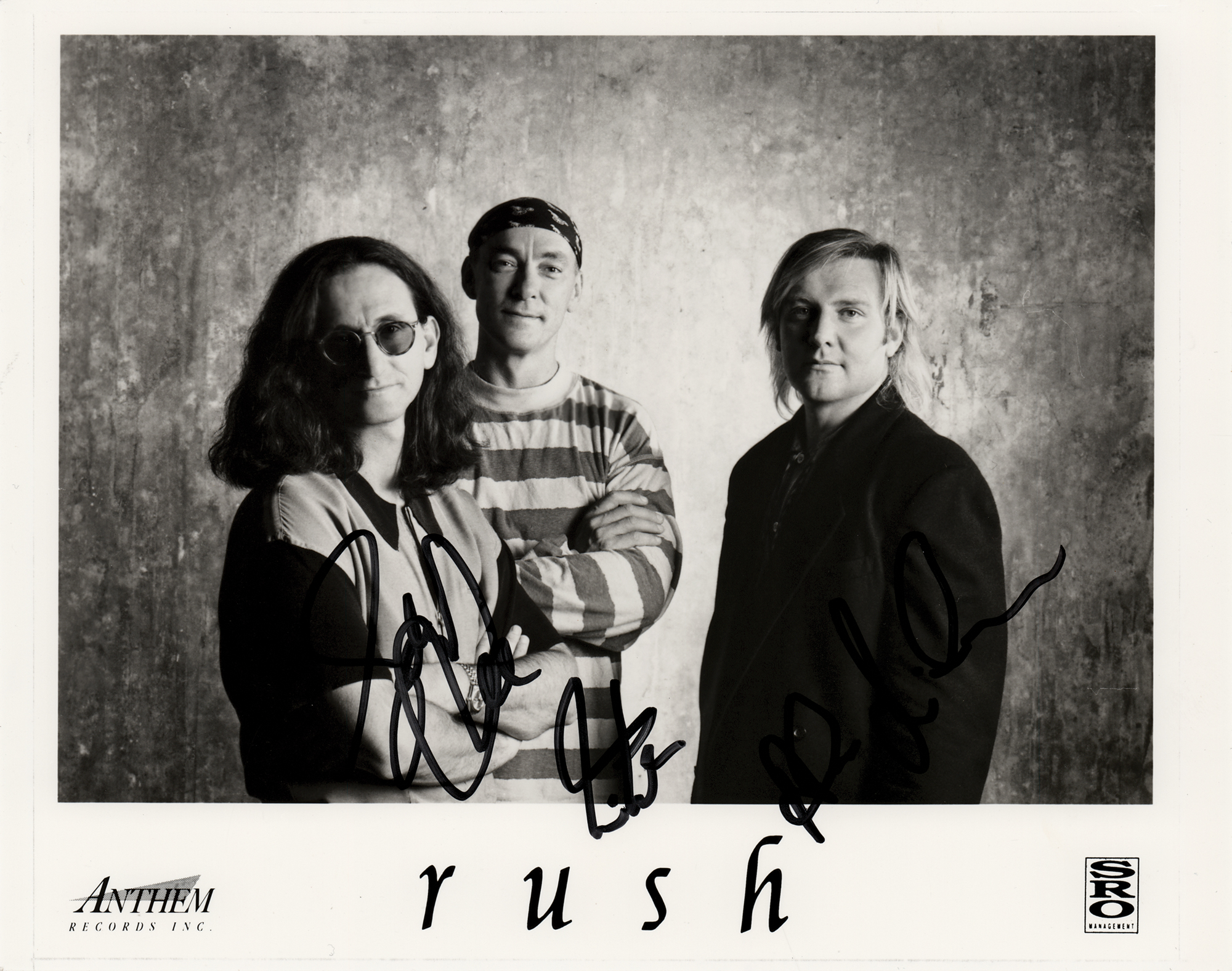 Satin-finish 10 x 8 Anthem Records publicity photo of the band, signed in black felt tip by Neil Peart, Geddy Lee, and Alex Lifeson. In fine condition. Accompanied by a full letter of authenticity from Beckett Authentication Services.