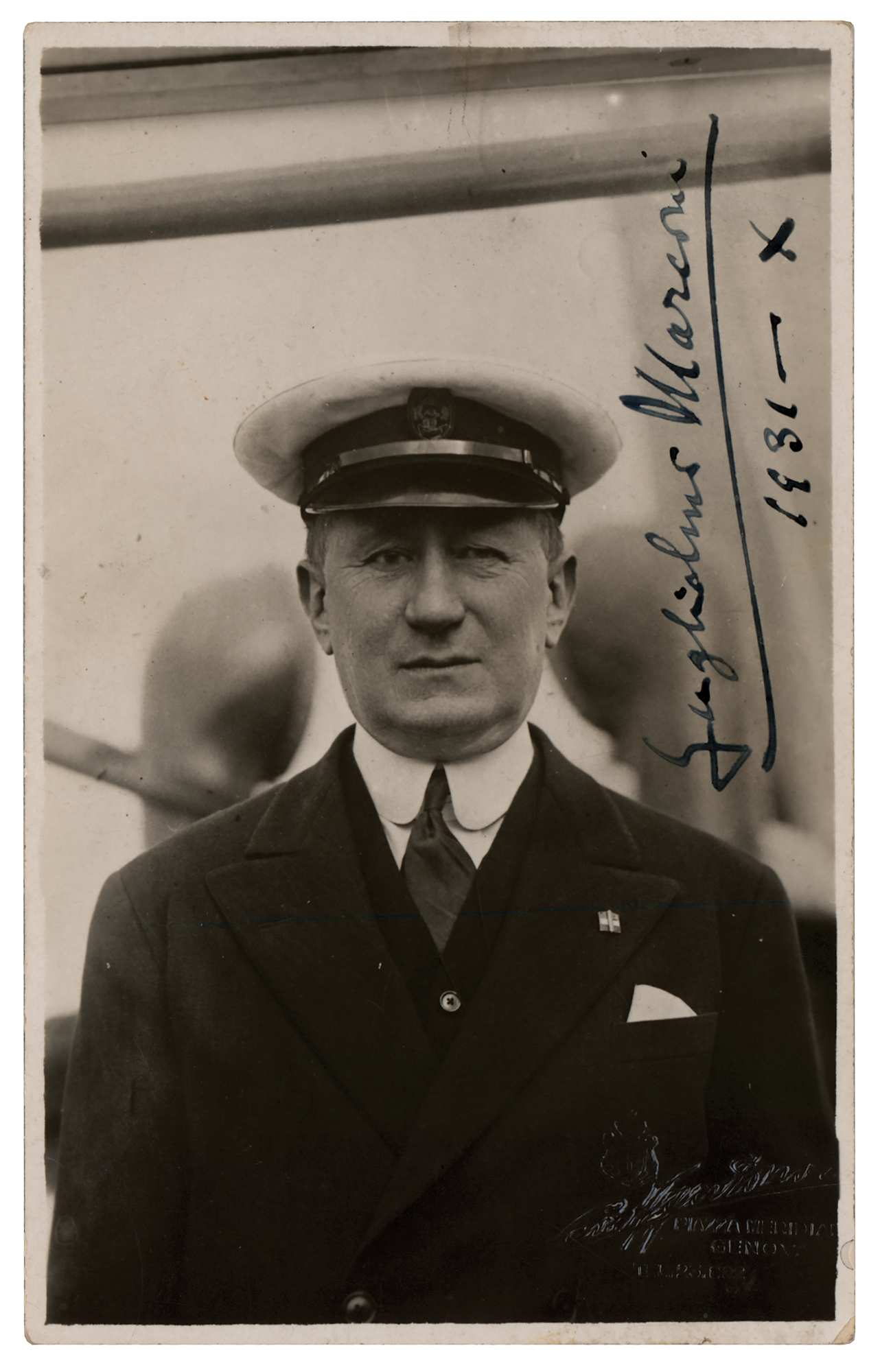 Uncommon vintage glossy 3.5 x 5.5 postcard photo of Marconi in a head-and-shoulders pose aboard a ship, boldly signed and inscribed in fountain pen, "Guglielmo Marconi, 1931—X.” In fine condition, with some light scuffing.