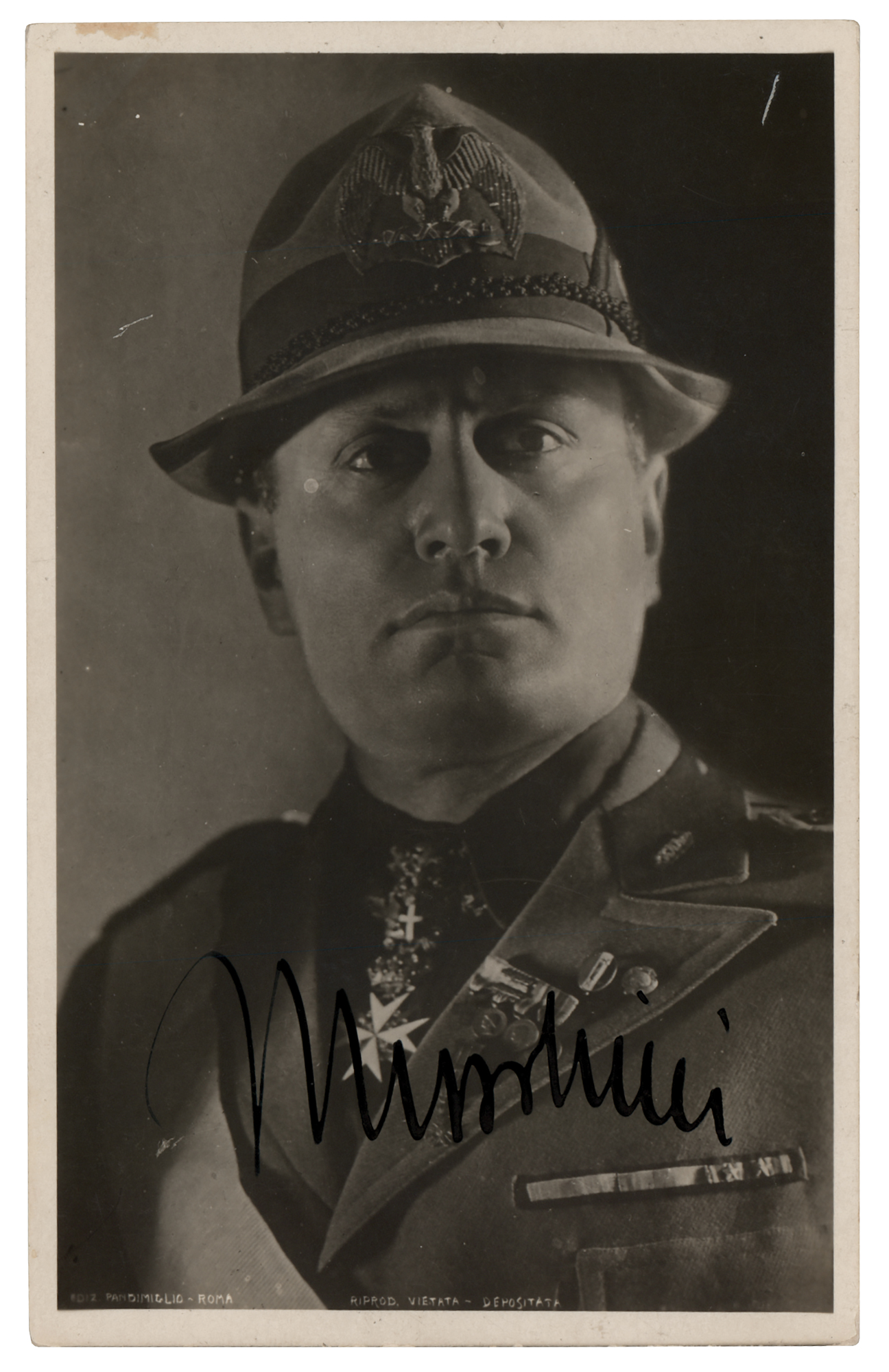 Scarce vintage matte-finish 3.5 x 5.5 postcard photo of Benito Mussolini in uniform, signed in bold fountain pen, "Mussolini." In fine condition, with light silvering to the darker areas of the image.