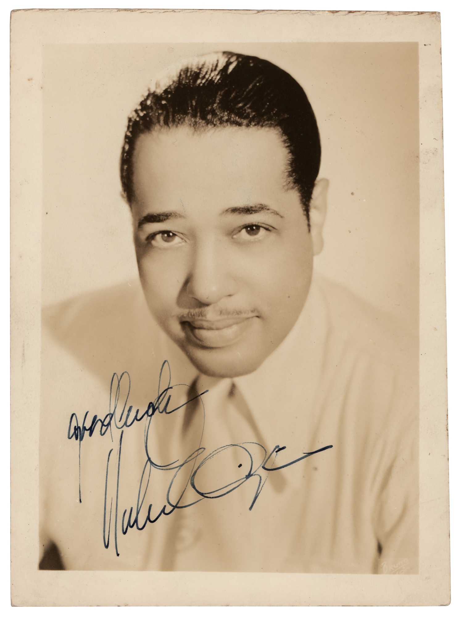 Vintage matte-finish 5 x 6.75 head-and-shoulders photo of the jazz orchestra bandleader, signed in fountain pen, "Good luck, Duke Ellington." In fine condition.
