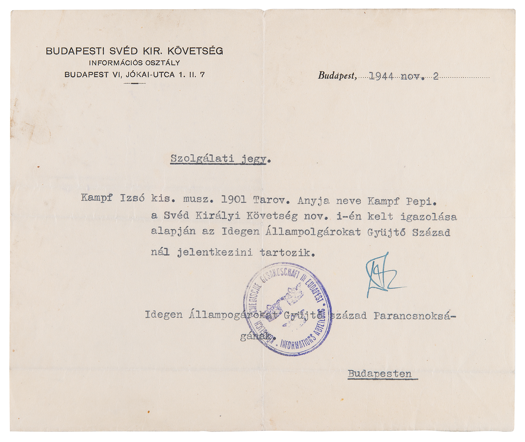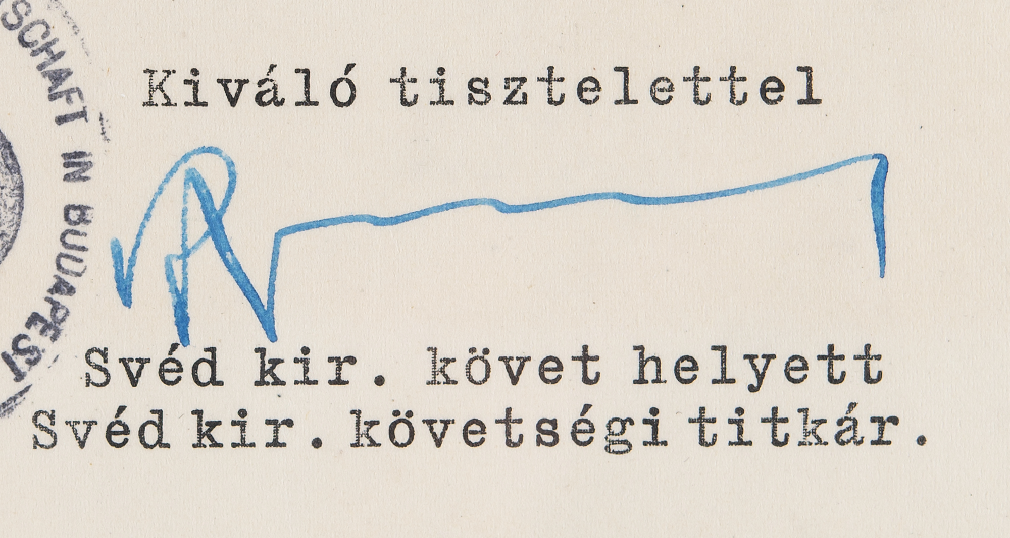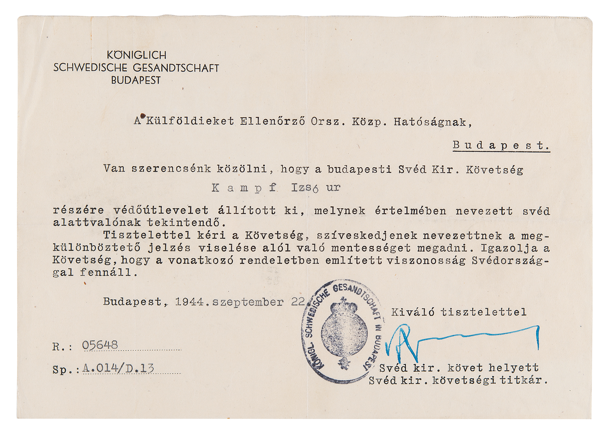 World War II-dated DS in Hungarian, signed “R. Wallenberg,” one page, 8.25 x 5.75, September 22, 1944. Document associated with the issuance of a Schutz-Pass, in part (translated): "To the National Central Authority Supervising Foreigners…We are pleased to inform you that the Royal Swedish Legation in Budapest has issued a protective passport to Mr. Kampf Iszo according to which the above-named person must be considered a Swedish citizen. The Legation kindly requests that the above-named individual be exempt from wearing the distinguishing symbol. The Legation certifies that the reciprocity mentioned in the relevant regulation exists with Sweden." While Wallenberg typically signed Schutz-Passes with quick scribbles, this associated issuing document boasts a more complete signature. In fine condition. Accompanied by a related “Service Ticket” document from the Budapest-Swedish embassy.