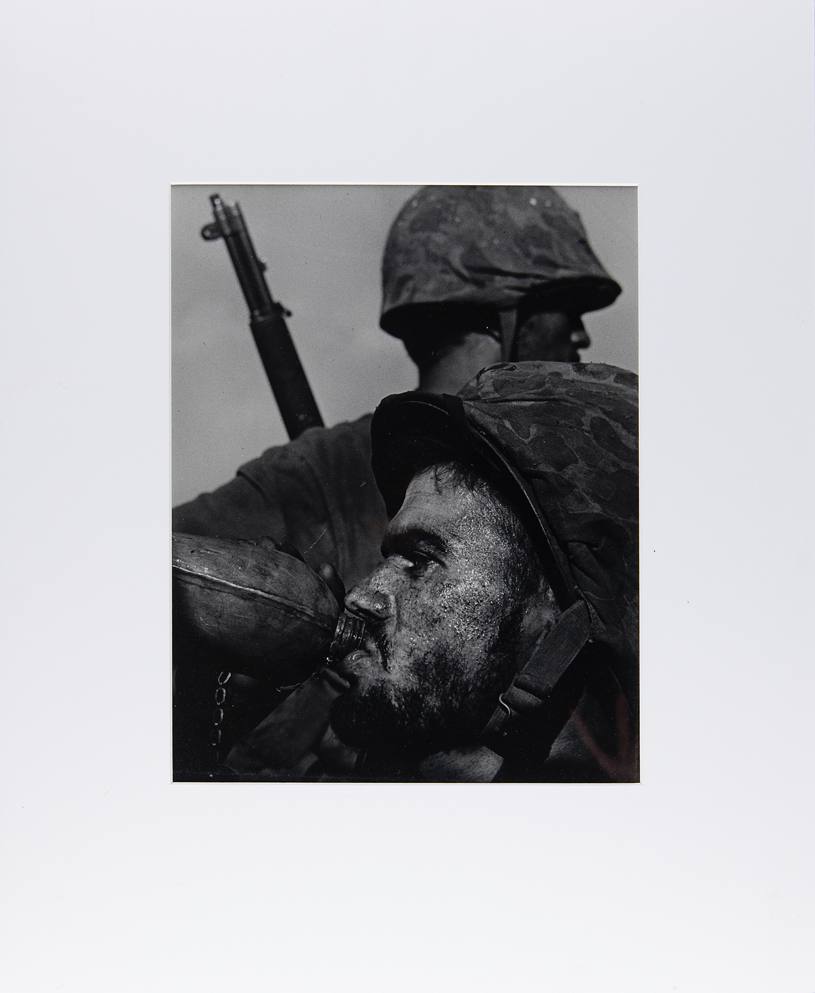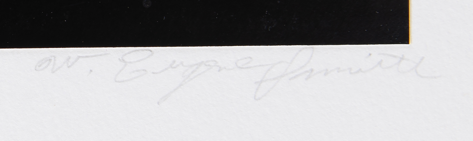 Original semi-glossy 10.5 x 13.25 photograph of two soldiers in the Battle of Saipan during the Pacific Campaign of World War II, affixed to a 16 x 20 mount, titled and signed on the mount in pencil by the photographer, "Saipan - Eugene Smith." Matted to an overall size of 18 x 22, with the opening cropped to the image area. In very fine condition.
