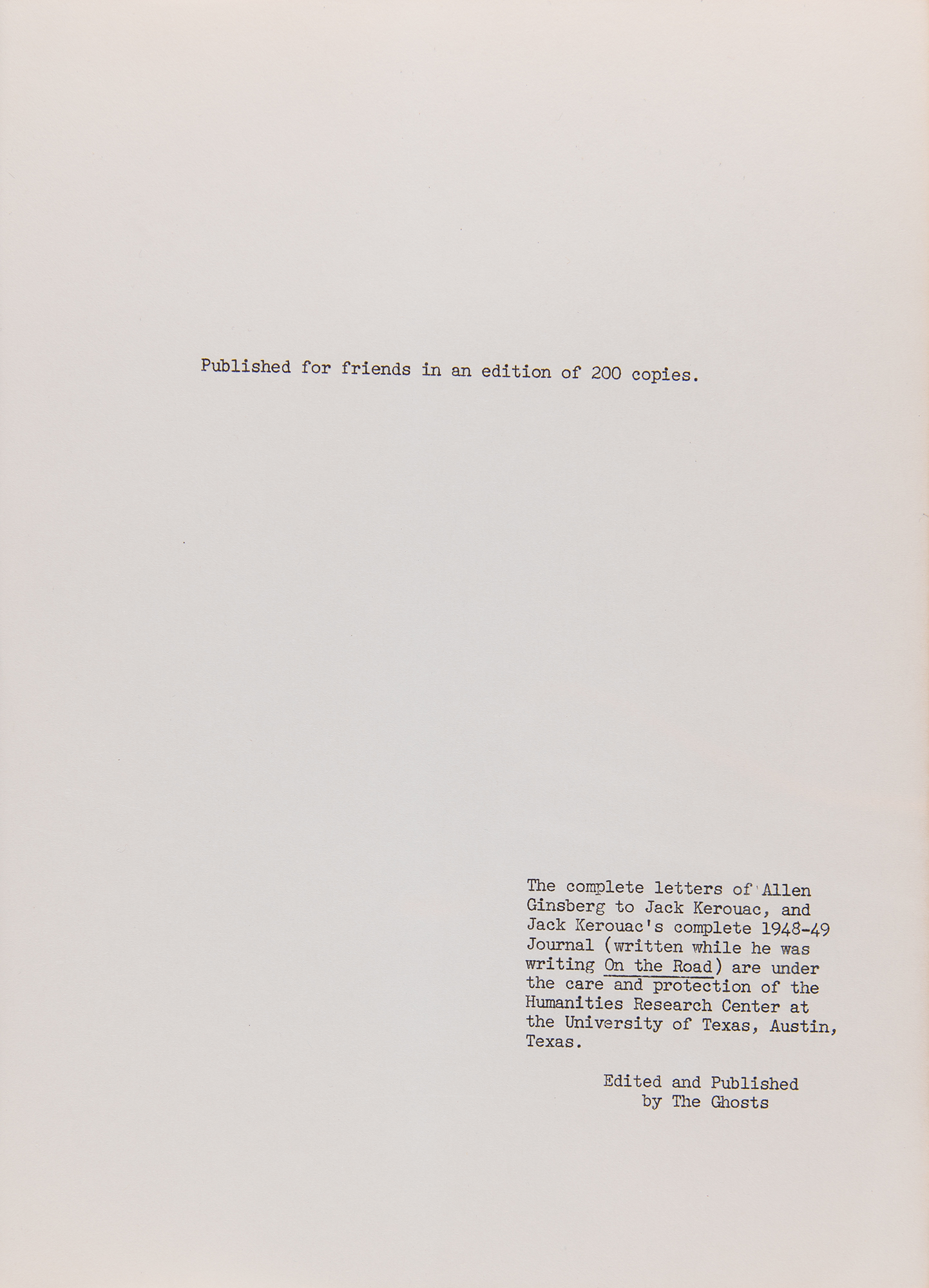 Unsigned staple-bound softcover book entitled "Take Care of My Ghost, Ghost," by Jack Kerouac and Allen Ginsberg, 8.5 x 11, published for friends in an edition of 200 by Ghost Press in 1977. The book contains excerpts from letters of Allen Ginsberg to Jack Kerouac between 1945 and 1959, as well as excerpts from the 1948–49 journals of Jack Kerouac. In fine condition.