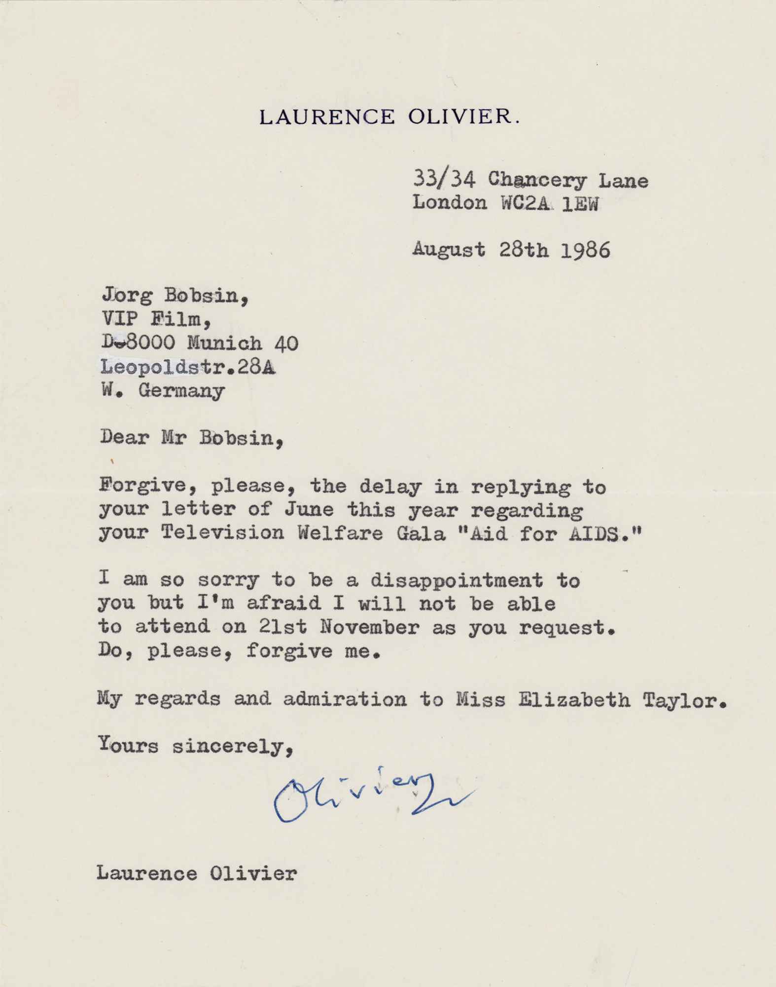 TLS signed “Olivier,” one page, 5.5 x 7, personal letterhead, August 28, 1986. Letter to Jorg Bobsin of VIP Film, in part: "Forgive, please, the delay in replying to your letter of June this year regarding your Television Welfare Gala 'Aid for AIDS.' I am so sorry to be a disappointment to you but I'm afraid I will not be able to attend...My regards and admiration to Miss Elizabeth Taylor." In very fine condition.