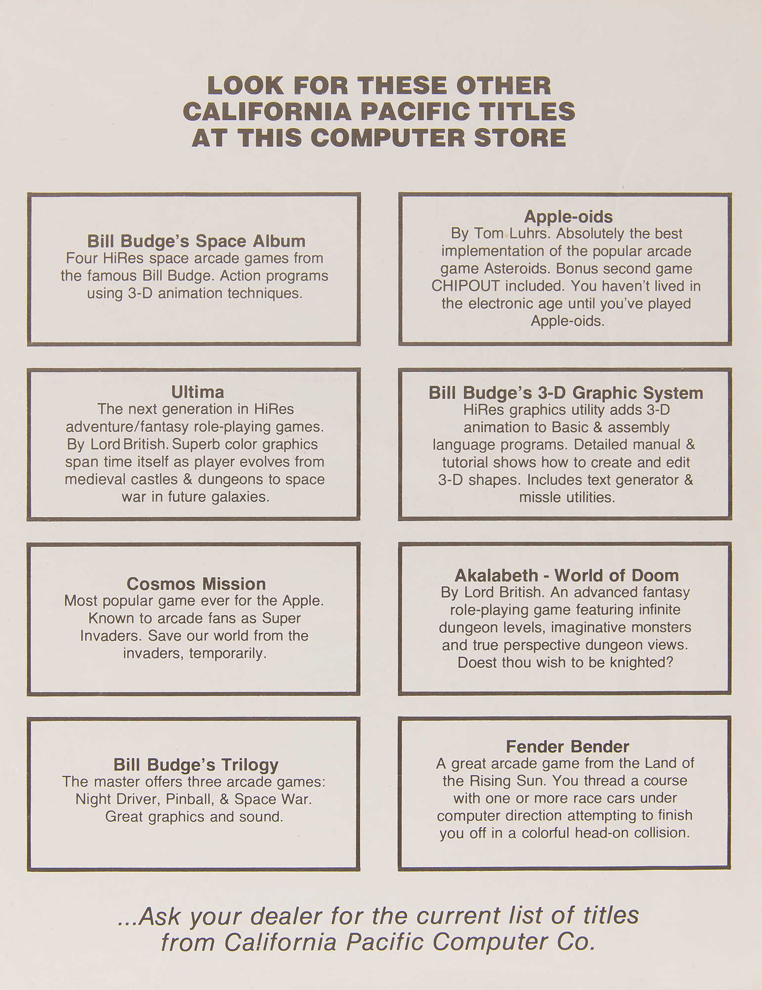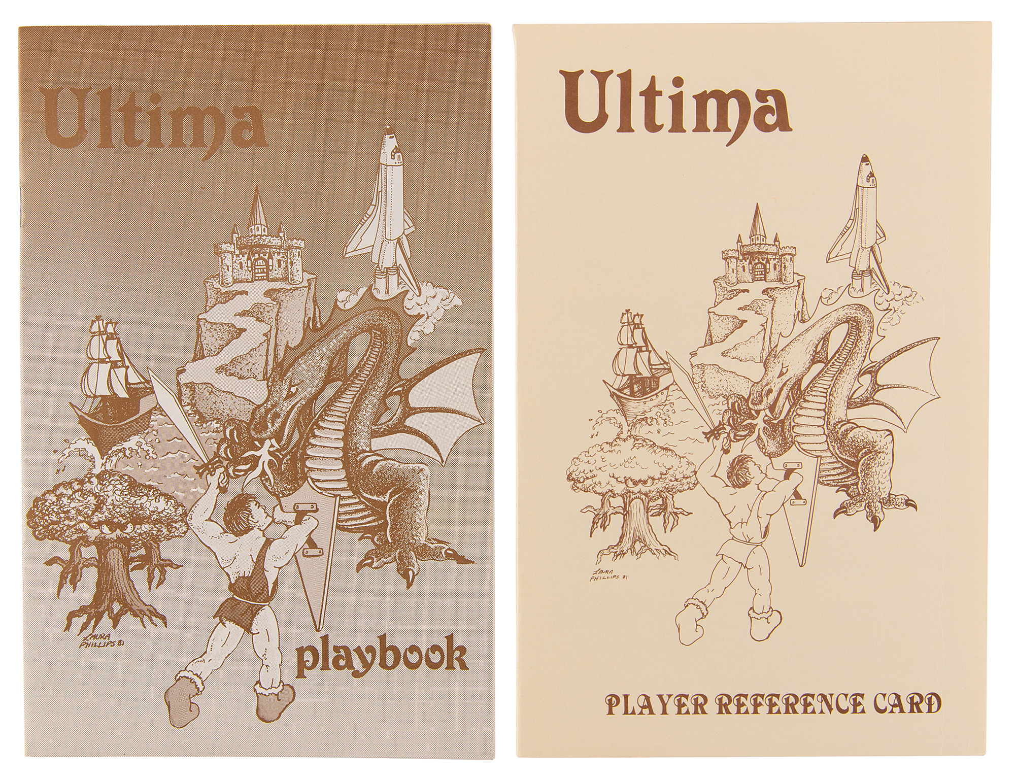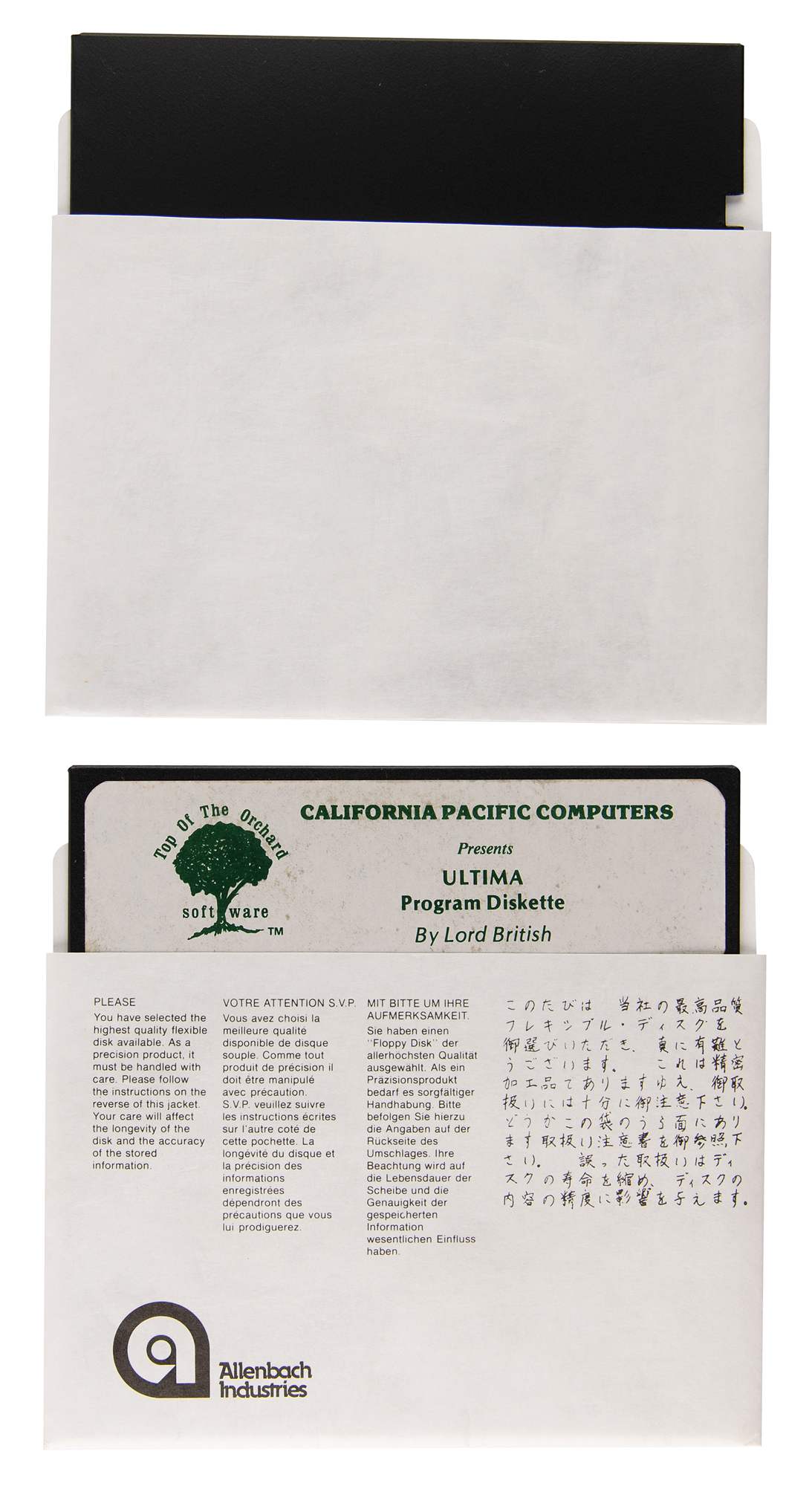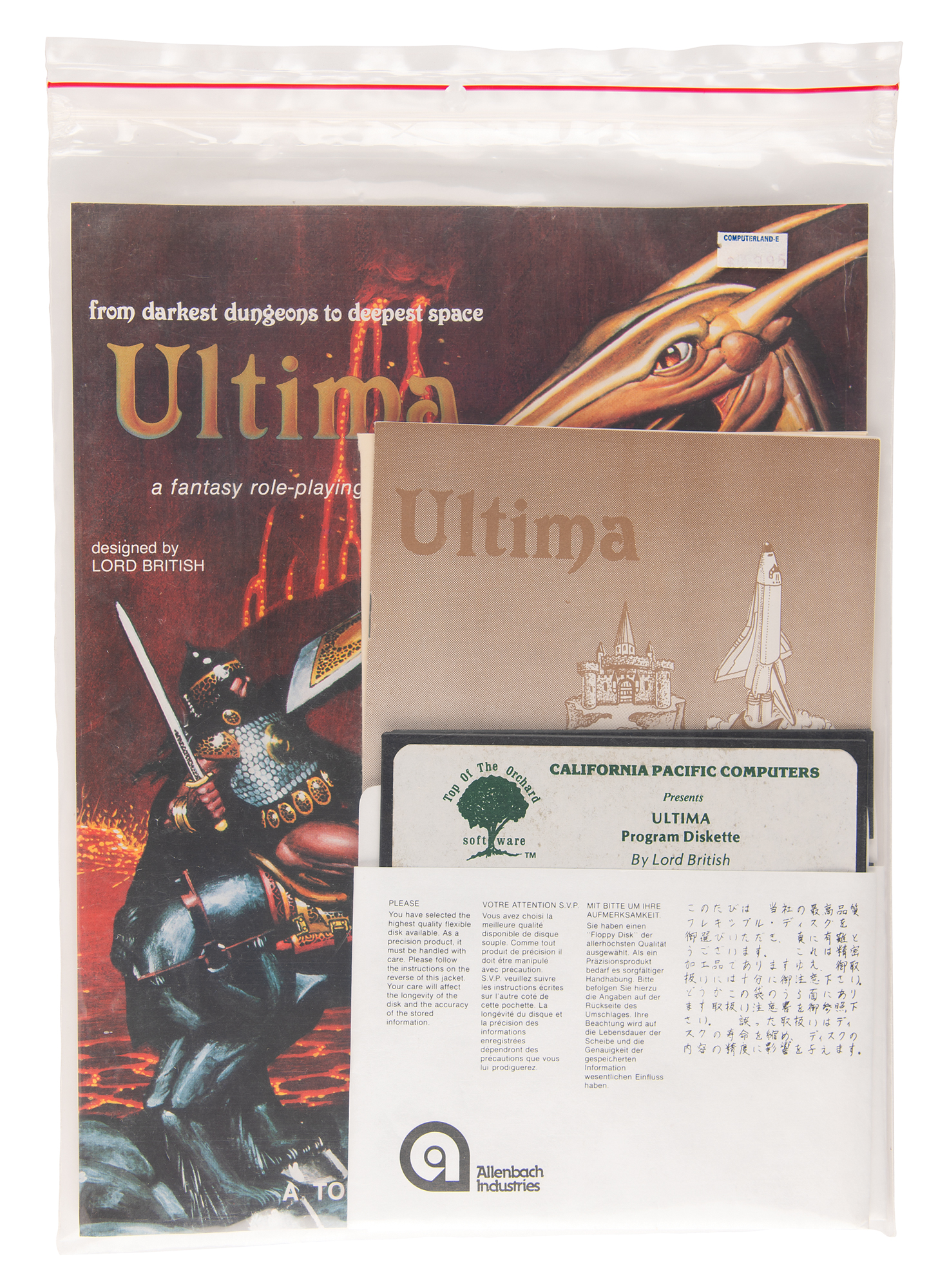 Rare original Ultima game published for the Apple II platform by California Pacific Computers in 1981, complete in its original packaging with colorful 8.5 x 11 'cover art' page, Ultima playbook, and Ultima player reference card. The original bag retains its $39.95 retail price tag from "Computerland." In fine to very fine condition, with a bit of creasing to the 'cover art' sheet. This was the very first release of Ultima, one of the first definitive commercial computer RPGs. The game is considered to represent an important and influential turning point for the development of the RPG genre, and is recognized as the first open-world computer game.