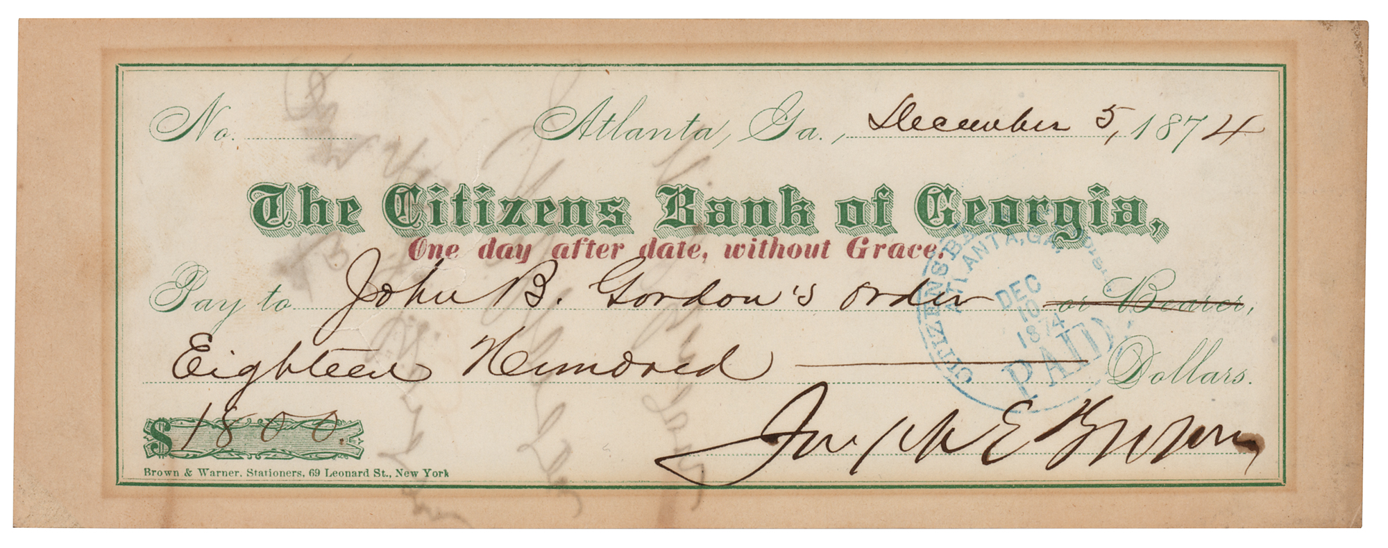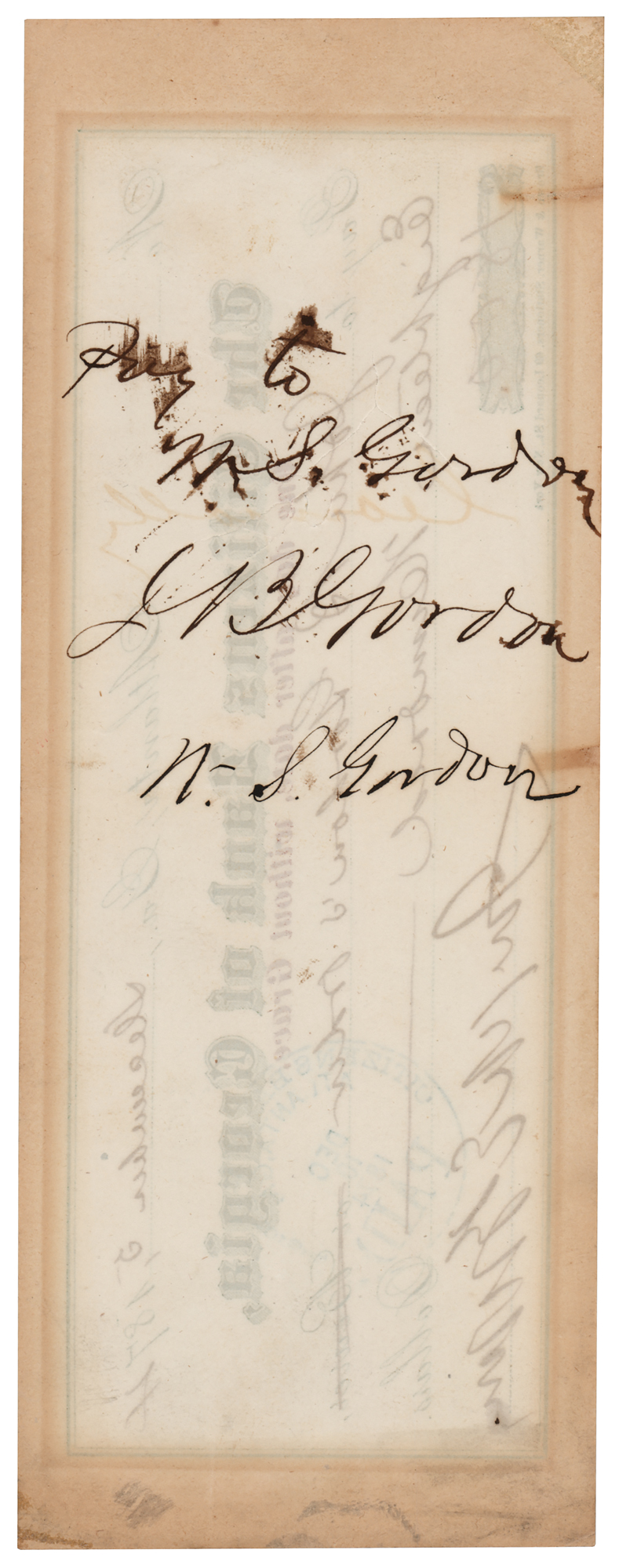 Confederate general (1832–1904) who surrendered Lee's army to Union General Joshua Lawrence Chamberlain at Appomattox Court House. After the war, he served as a senator from Georgia, as well as the state's 53rd governor. Citizen's Bank of Georgia check, 8 x 3, filled out in another hand and signed by Georgia's Confederate Governor Joseph E. Brown, payable to John B. Gordon's order for $1,800, December 5, 1874, endorsed on the reverse by Gordon, "Pay to W. S. Gordon, J. B. Gordon," also signing for his brother below. In fine condition.