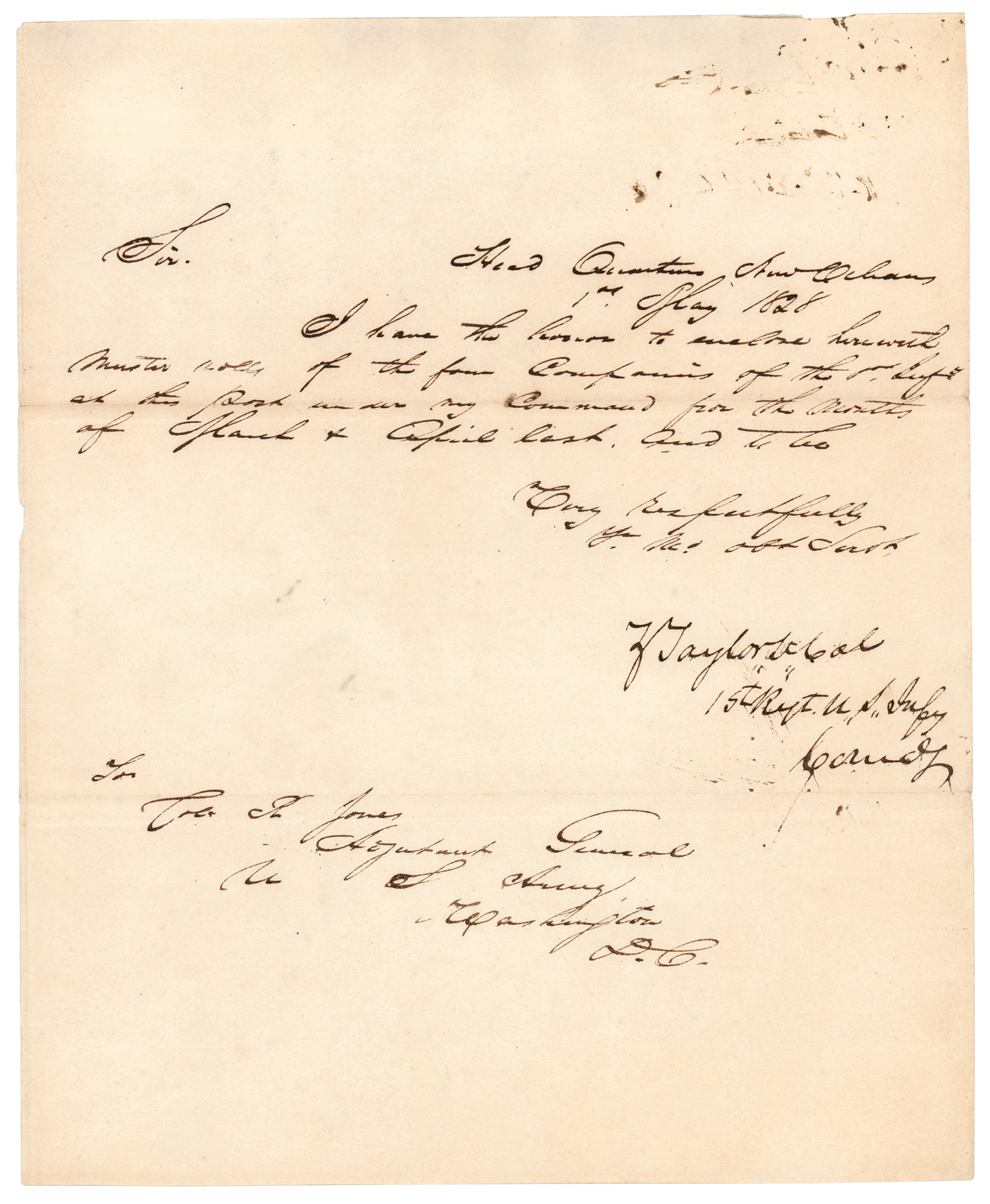 LS signed “Z. Taylor, Lt. Col., 1st Regt. U.S. Infy., Comd'g,” one page, 7.75 x 9.5, May 1, 1828. Letter to Adjutant General Roger Jones in Washington, D.C., sent from Taylor's headquarters at New Orleans. In full: "I have the honor to enclose herewith muster rolls of the four companies of the 1st Regt. at the post under my command for the months of March & April last." In fine condition, with mounting remnants along the reverse top edge.
