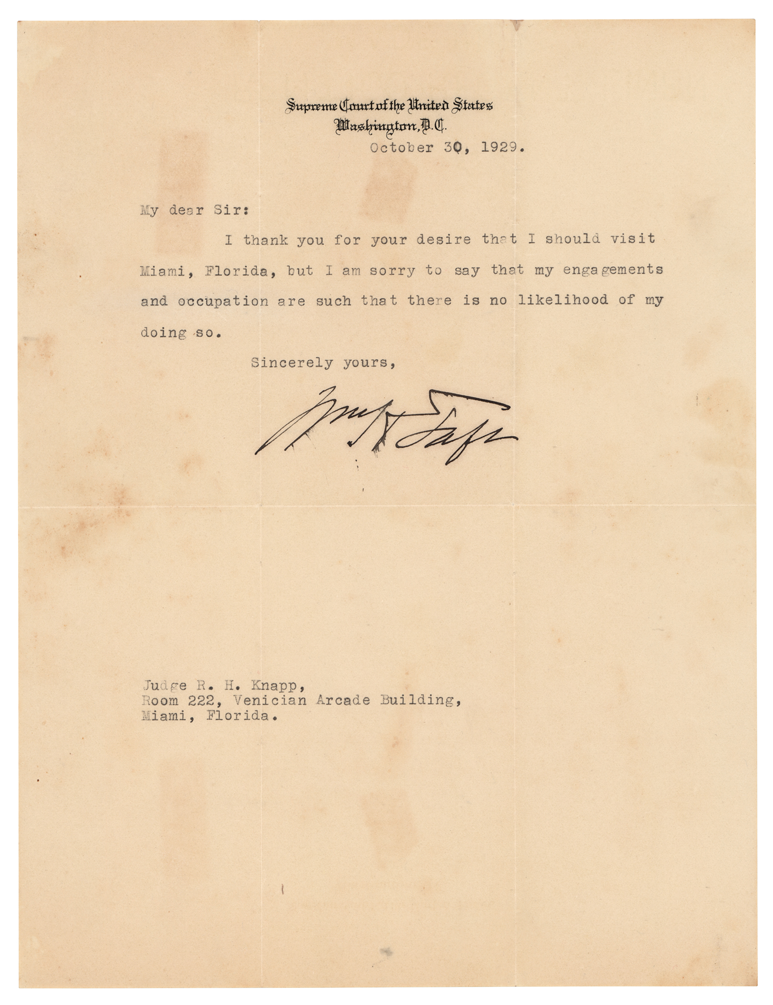 TLS as Chief Justice, signed “Wm. H. Taft,” one page, 8 x 10.5, Supreme Court of the United States letterhead, October 30, 1929. Letter to Judge R. H. Knapp, in full: “I thank you for your desire that I should visit Miami, Florida, but I am sorry to say that my engagements and occupation are such that there is no likelihood of my doing so.” In very good to fine condition, with scattered light stains. Richard H. Knapp (1841-1934), a New York native, lived in several states and worked a variety of jobs. He was a Justice of the Peace in Nebraska, a carpenter in North Dakota, a milk delivery driver in Minnesota, and later a financial secretary in Florida at the popular Miami Three Score and Ten Club, possibly where Taft was invited.