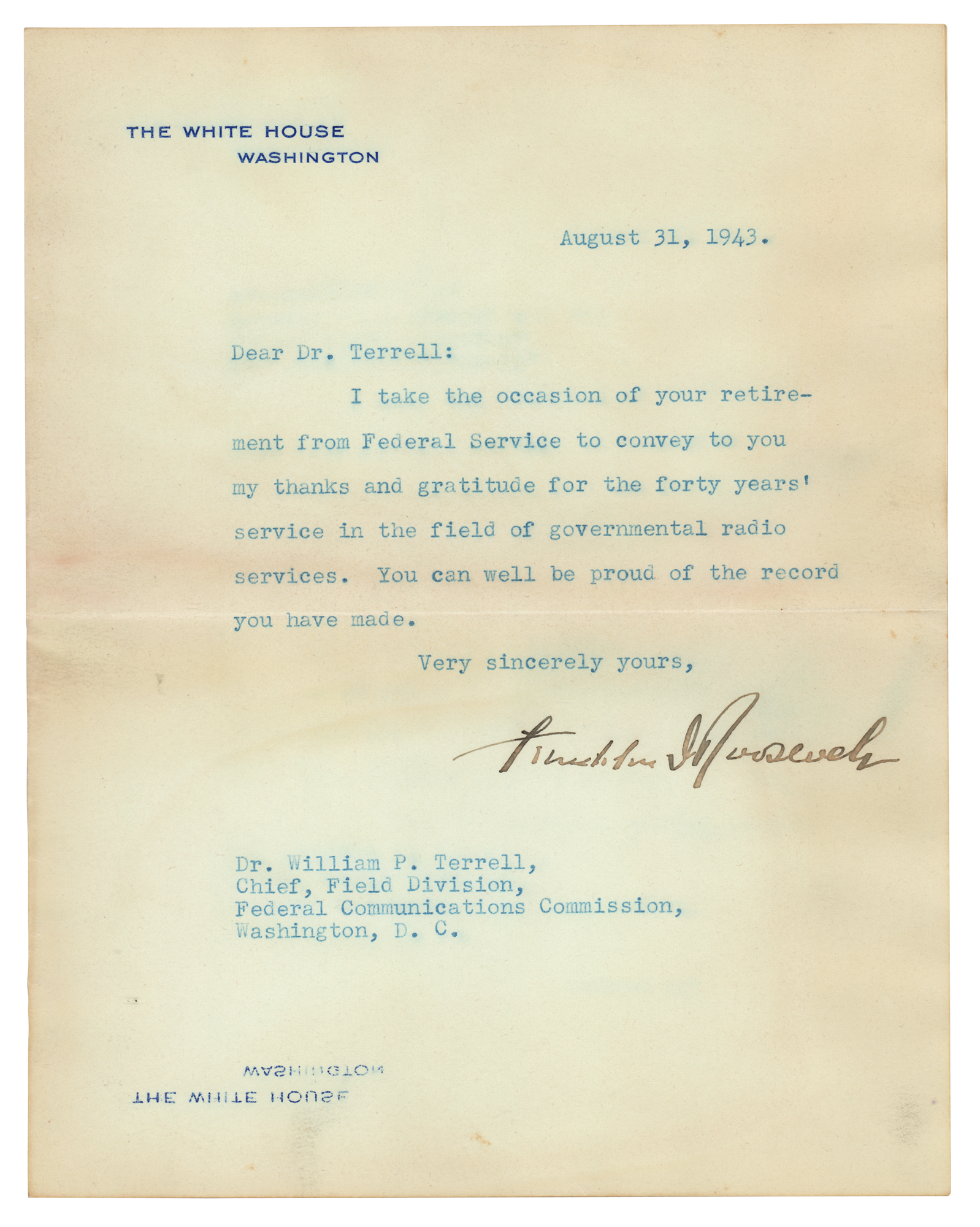 World War II-dated TLS as president, one page, 7 x 8.75, White House letterhead, August 31, 1943. Letter to Dr. William P. Terrell, Chief of the Field Division at the Federal Communications Commission, in full: “I take the occasion of your retirement from Federal Service to convey to you my thanks and gratitude for the forty years' service in the field of governmental radio services. You can well be proud of the record you have made.” In very good condition, with overall dampstaining affecting appearance. Accompanied by the original White House mailing envelope and by an official invitation for a reception at the White House on January 12, 1928; the latter also includes its White House envelope.