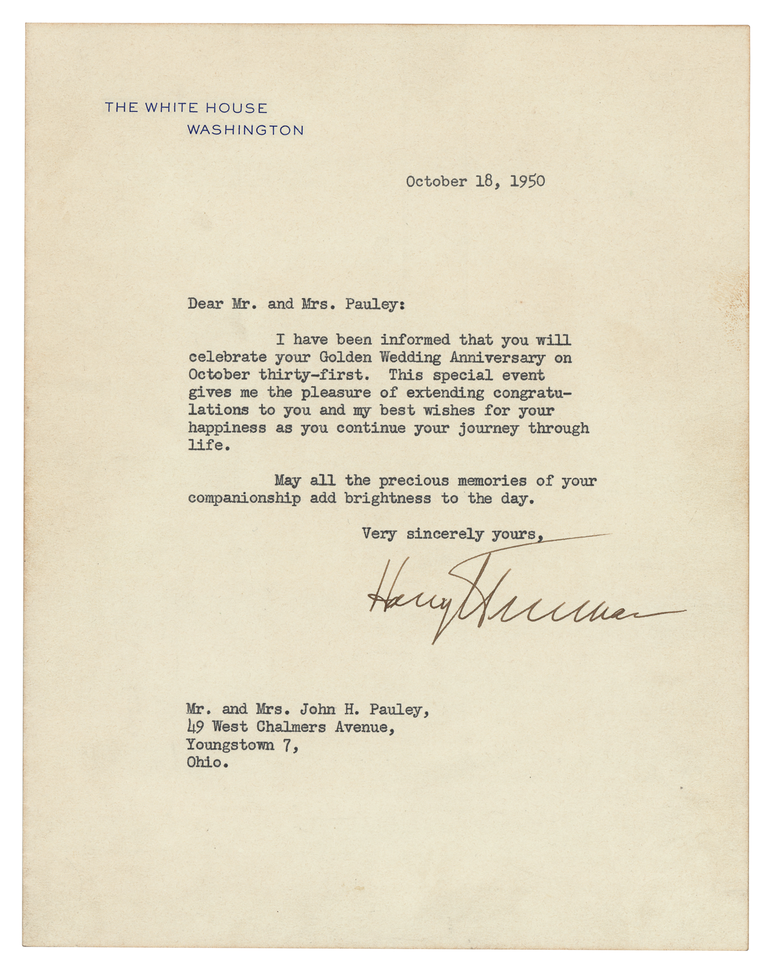 TLS as president, one page, 7 x 8.75, White House letterhead, October 18, 1950. Letter to Mr. and Mrs. John H. Pauley, in full: “I have been informed that you will celebrate your Golden Wedding Anniversary on October thirty-first. This special event gives me the pleasure of extending congratulations to you and my best wishes for your happiness as you continue your journey through life. May all the precious memories of your companionship add brightness to the day.” In very fine condition.