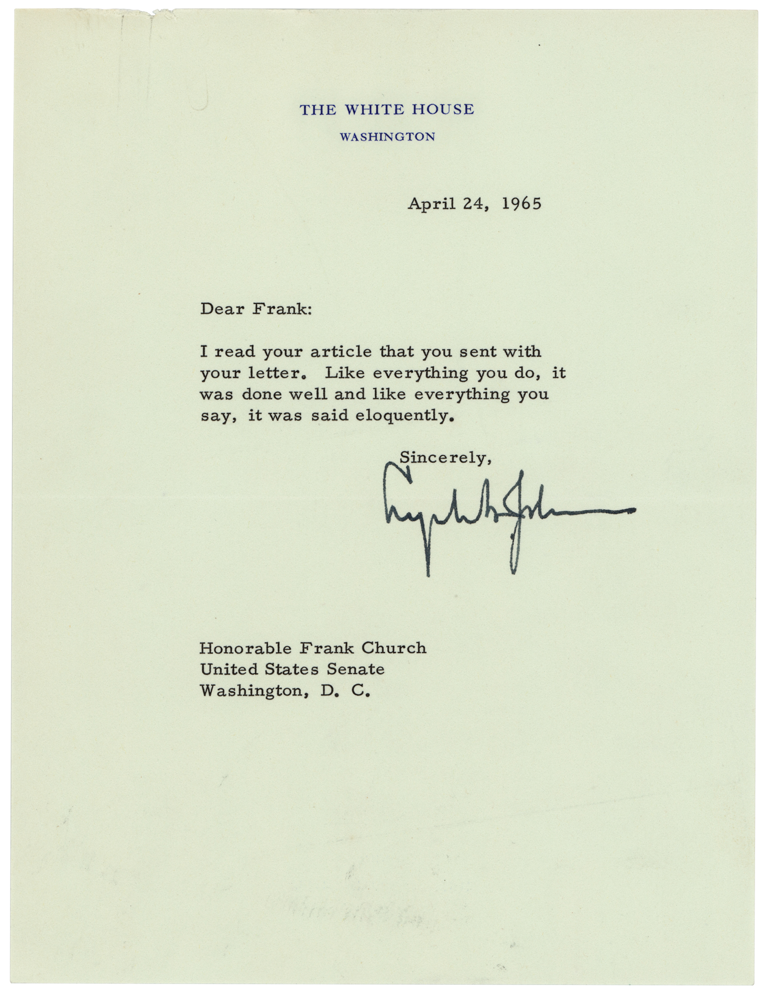 TLS as president, one page, 6.75 x 8.75, White House letterhead, April 24, 1965. Letter to former Idahoan senator Frank Church, in full: "I read your article that you sent with your letter. Like everything you do, it was done well and like everything you say, it was said eloquently." In fine condition, with a light paperclip impression to the top edge. Accompanied by a copy of the original letter from Church and by the April 24, 1965 issue of the Saturday Evening Post, which contains Church’s article, ‘We should negotiate a settlement in Vietnam (Speaking Out).’