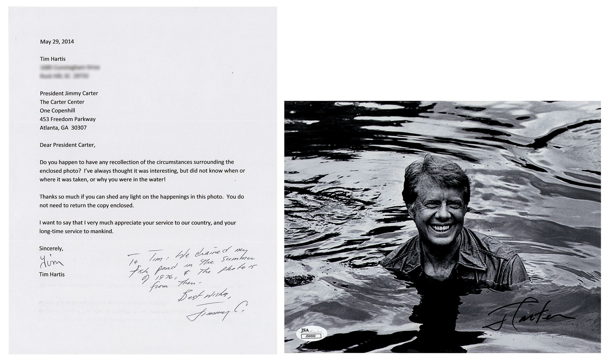 Two items: a glossy 10 x 8 photo of a smiling Jimmy Carter neck-deep in a fish pond at his home in Plains, Georgia, signed in black felt tip, “J. Carter”; and an ANS signed “Jimmy C.,” penned in black ballpoint at the bottom of a 2014 letter from a collector asking his recollections of the included photo. Carter’s handwritten response reads: “To Tim: We drained my fish pond in the summer of 1976, & the photo is from then.” In overall fine condition, with a JSA label affixed to the photo, which includes a certificate of authenticity from JSA. Accompanied by the original mailing envelope, which bears Carter's facsimile franking signature.