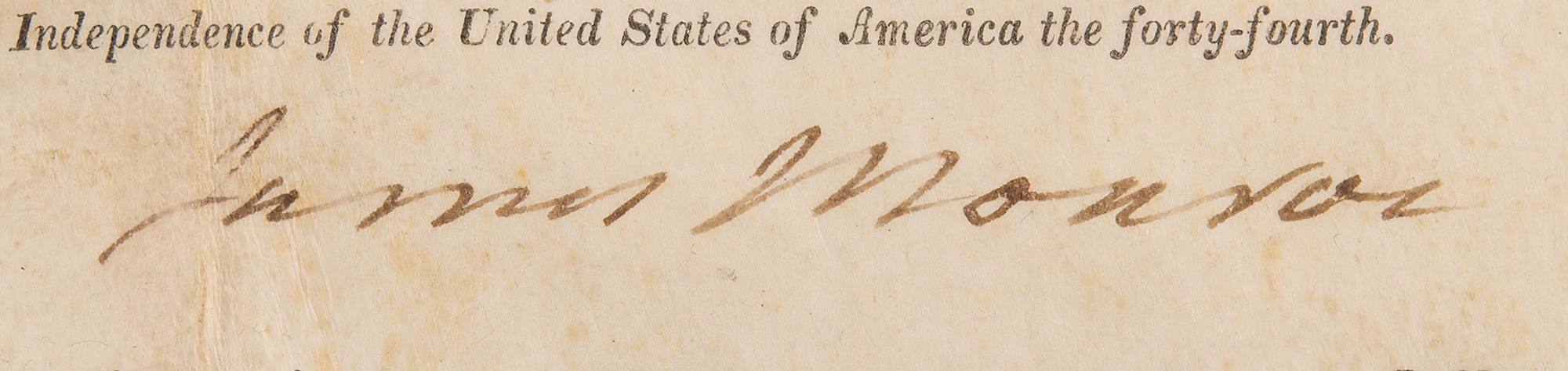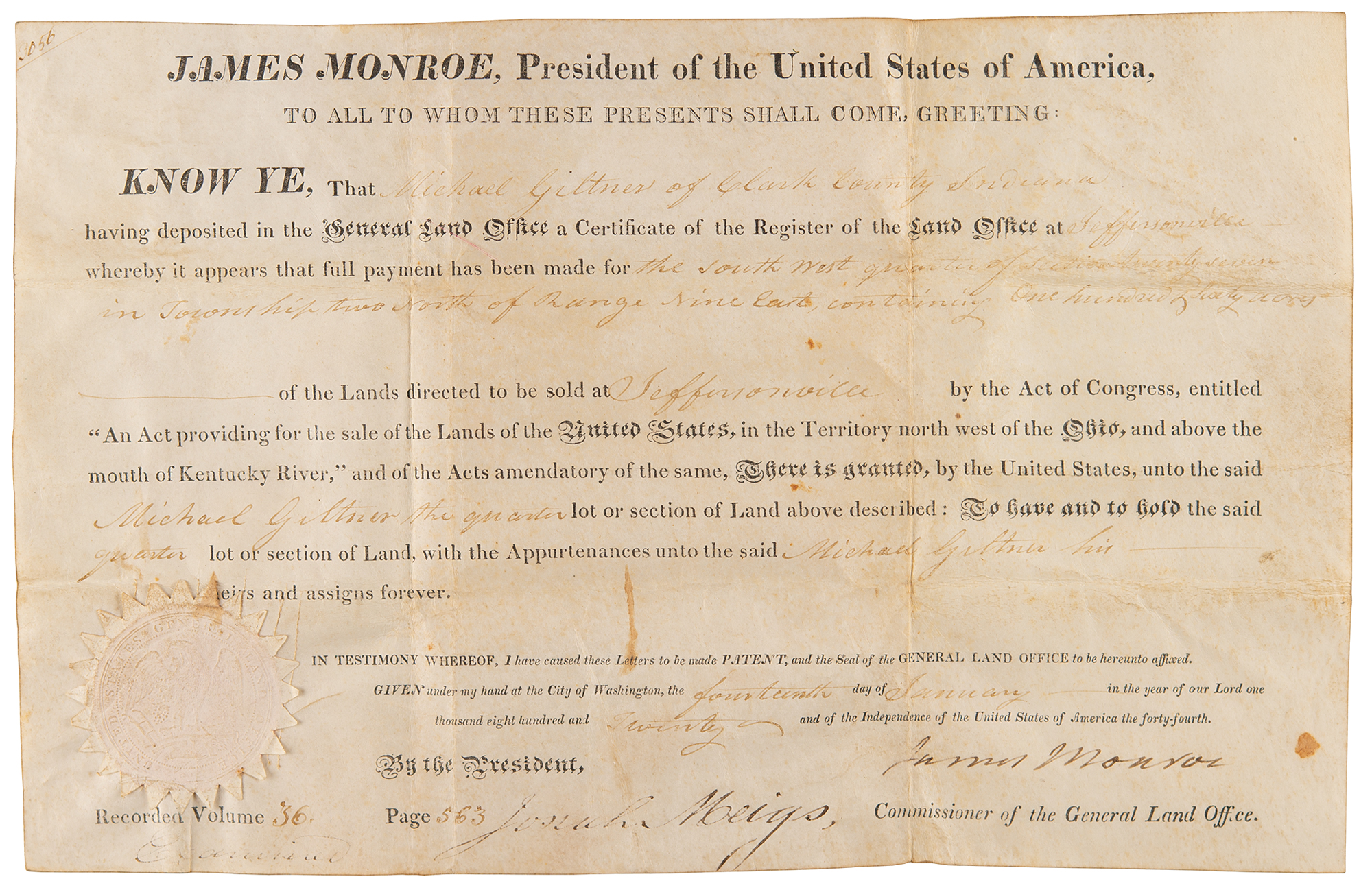 Partly-printed vellum DS as president, one page, 13 x 8.25, January 14, 1820. President Monroe grants Michael Giltner of Clark County, Indiana, a tract "containing one hundred & sixty acres of the Lands directed to be sold at Jeffersonville." Neatly signed at the conclusion by President James Monroe and countersigned by Commissioner of the General Land Office Josiah Meigs. The white paper seal affixed at the lower left remains intact. In fine condition, with light soiling and a few small stains.