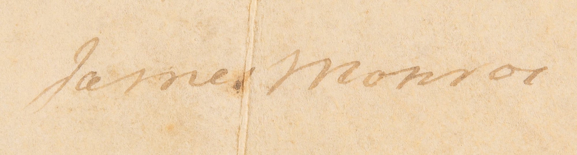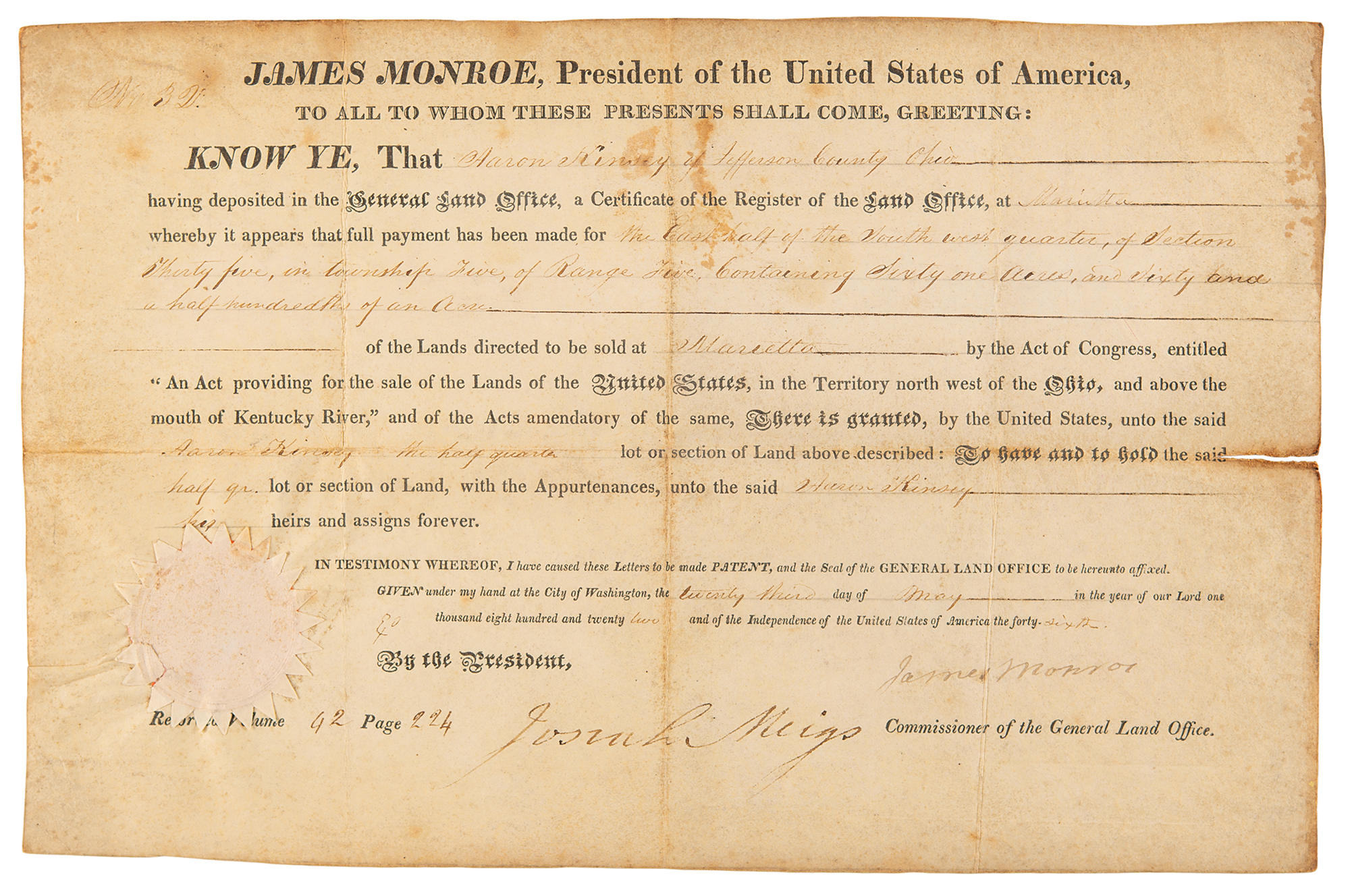 Partly-printed vellum DS as president, one page, 14 x 9.25, May 23, 1822. President Monroe grants a parcel of land to Aaron Kinsey of Jefferson County, Ohio, "containing Sixty one Acres, and Sixty and a half-hundredths of an Acre, of the Lands directed to be sold at Marietta." Neatly signed at the conclusion in ink by President James Monroe, and countersigned by Commissioner of the General Land Office Josiah Meigs. The white paper seal affixed at the lower left remains intact. In very good to fine condition, with light soiling and scattered staining, and a partial edge split to the horizontal fold.