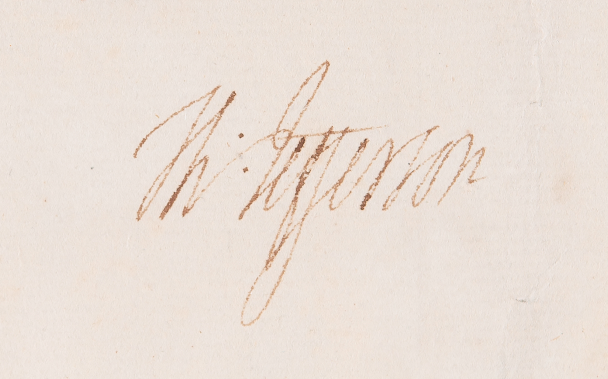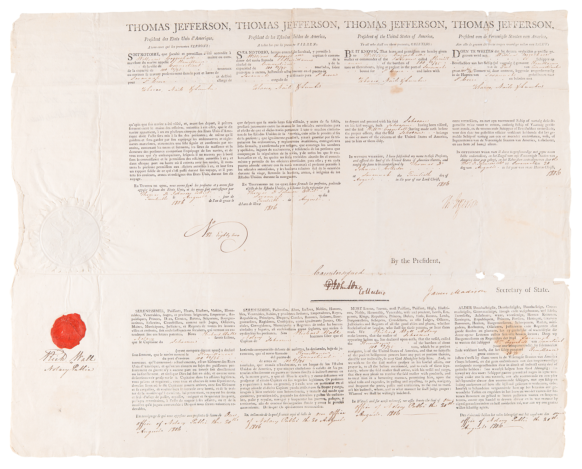 Partly-printed DS signed “Th: Jefferson” as president and “James Madison” as secretary of state, one page, 21 x 16.5, August 20, 1806. Four-language ship's pass issued to "William Coggeshall, master or commander of the Schooner called Remittance…lying at present in the port of Savannah, bound for St. Croix and laden with Tobacco, Nails & Lumber." Neatly signed at center in ink by President Thomas Jefferson, and countersigned below by Secretary of State James Madison. The original white paper seal affixed to the left side remains fully intact. In very good to fine condition, with some minor paper loss along the intersecting folds, not affecting either signature. United States ships carried four-language sea letters in the 18th and 19th centuries to show ownership, nationality, cargo, and destination. This is a spectacular example, featuring a most desirable combination of presidents, and boasting a particularly crisp Jefferson signature.