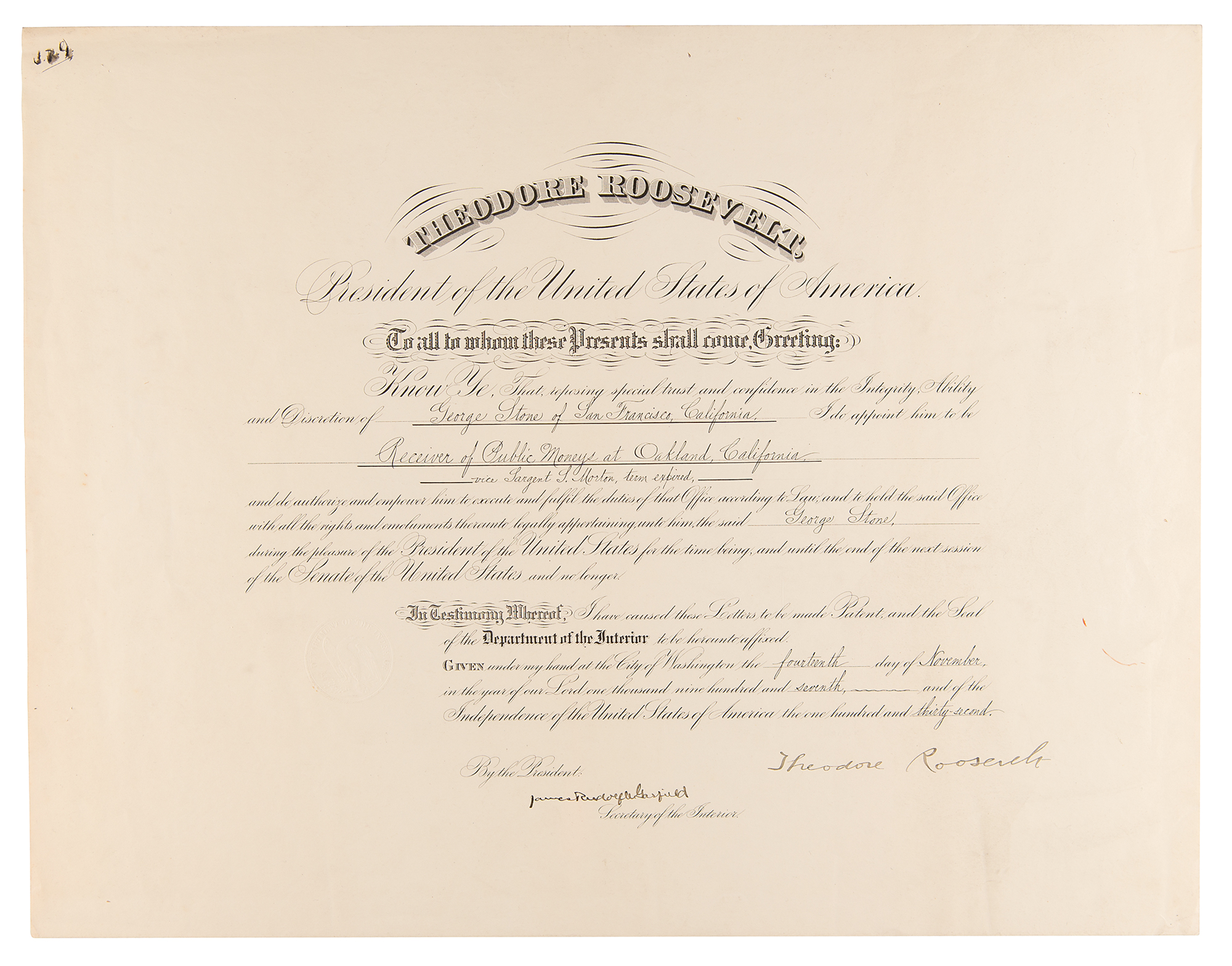 Partly-printed DS as president, one page, 22 x 17, November 14, 1907. President Roosevelt appoints George Stone of San Francisco, California as “Receiver of Public Moneys at Oakland, California.” Signed prominently at the conclusion by Theodore Roosevelt and countersigned by Secretary of the Interior James R. Garfield. The left side is embossed with the seal of the Department of the Interior. In fine condition. A crisp, highly presentable presidential document.