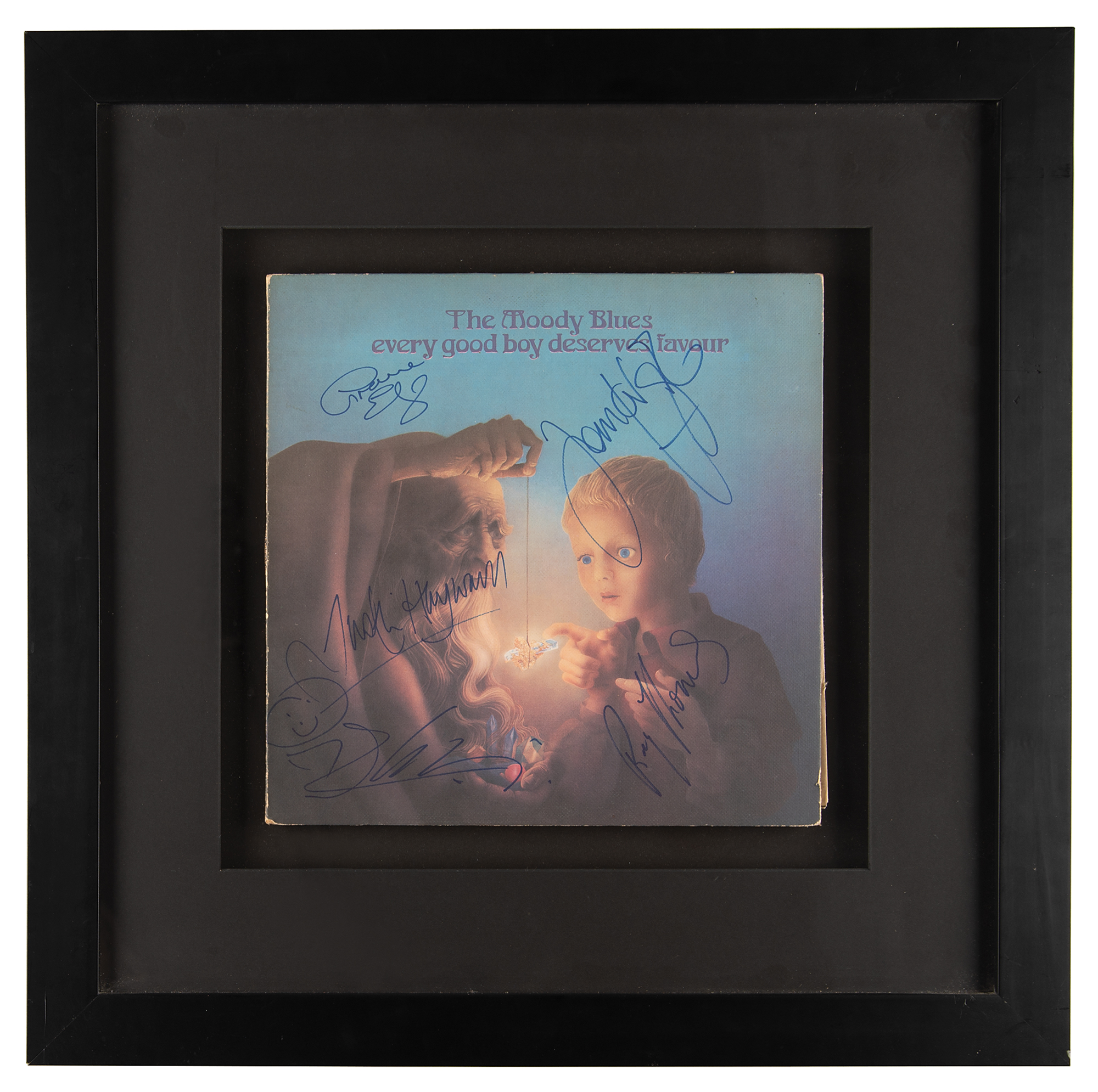 Every Good Boy Deserves Favour album by the Moody Blues, signed on the front cover in blue felt tip by Patrick Moraz, Justin Hayward, John Lodge, Ray Thomas, and Graeme Edge. Mounted and framed to an overall size of 23.25 x 23.25. In fine condition, with some edgewear.