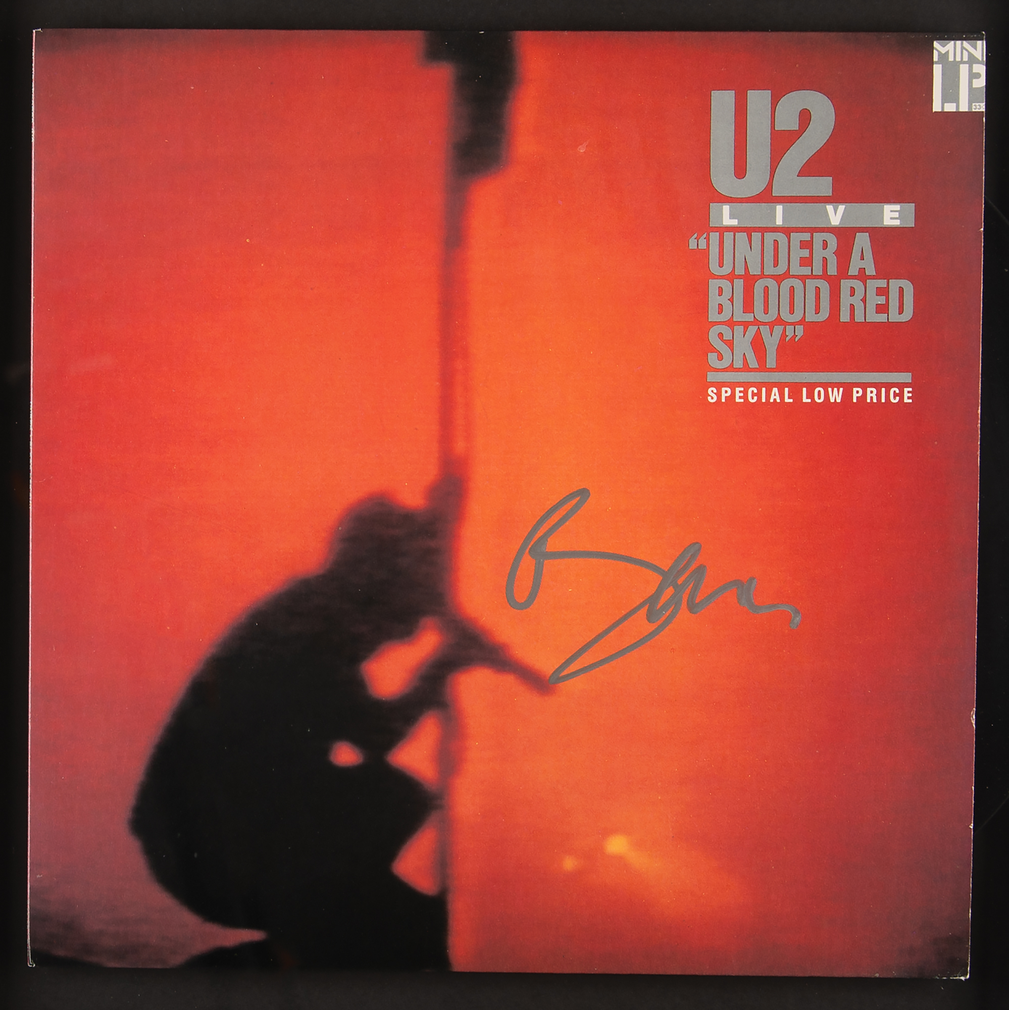 Under a Blood Red Sky live album by U2, signed on the front cover in silver ink by Bono. Mounted and framed to an overall size of 22.75 x 22.75. In fine condition.